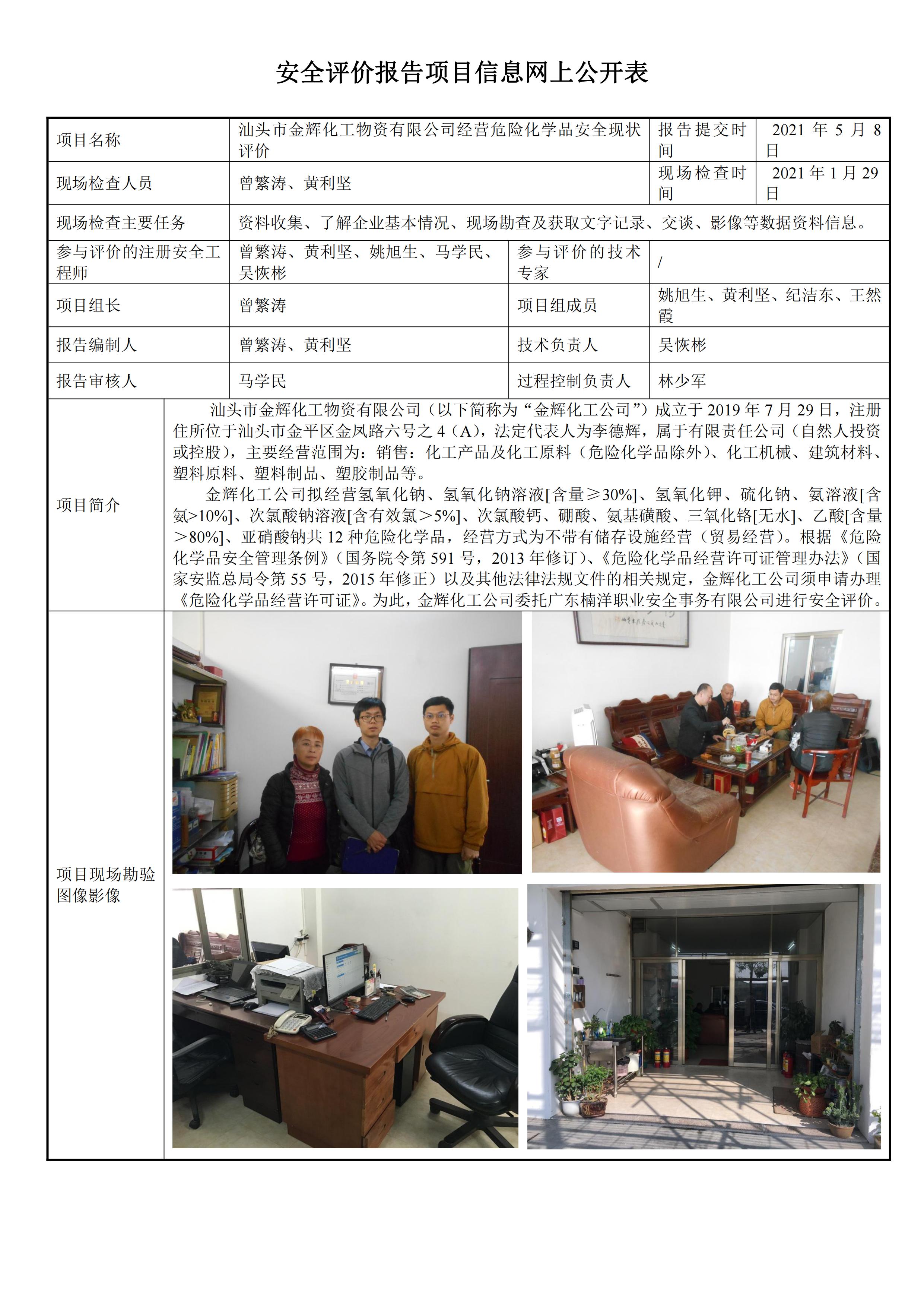 汕头市金辉化工物资有限公司经营危险化学品安全现状评价