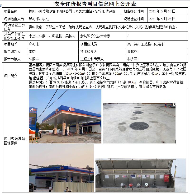 揭阳市阿美能源管理有限公司(阿美加油站)安全现状评价