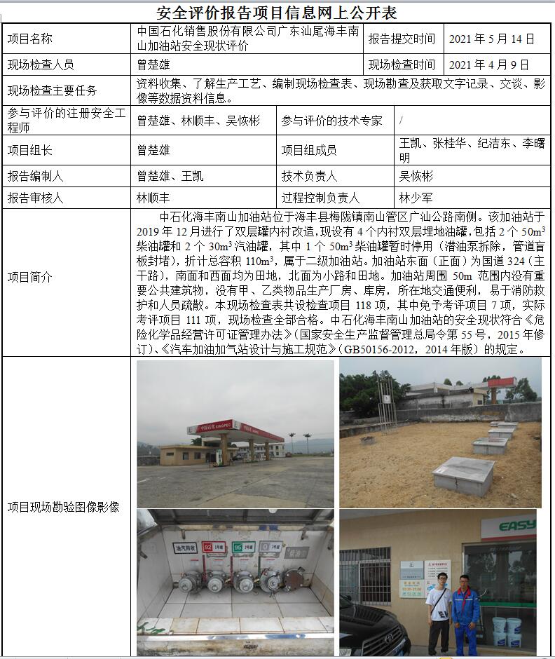 中国石化销售股份有限公司广东汕尾海丰南山加油站安全现状评价