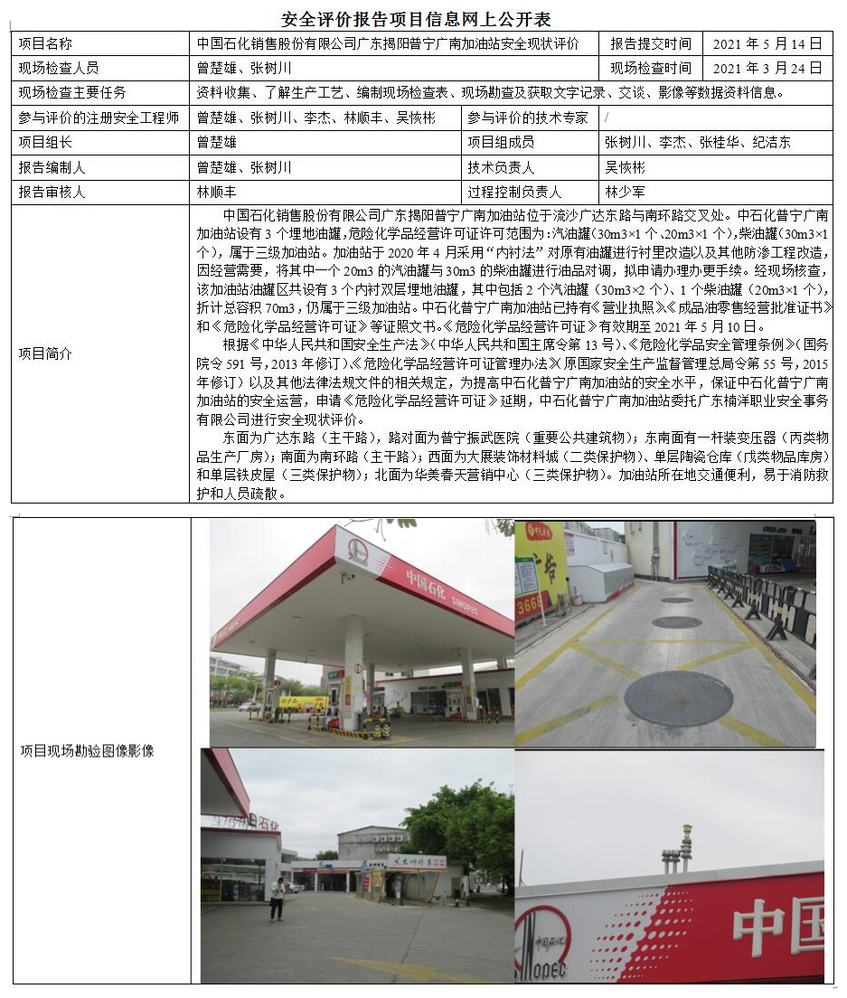 中国石化销售股份有限公司广东揭阳普宁广南加油站安全现状评价