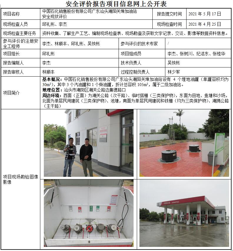 中国石化销售股份有限公司广东汕头潮阳关埠加油站安全现状评价