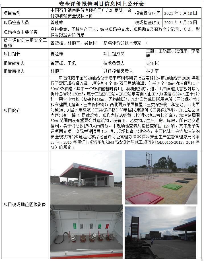 中国石化销售股份有限公司广东汕尾陆丰金竹加油站安全现状评价