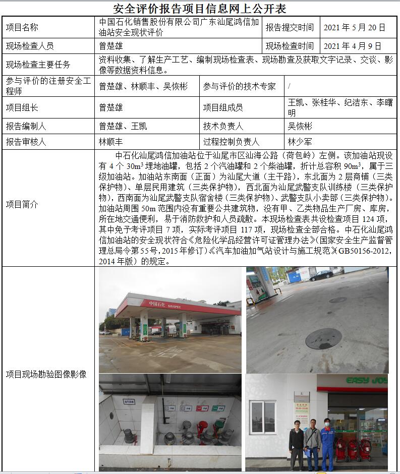 中国石化销售股份有限公司广东汕尾鸿信加油站安全现状评价