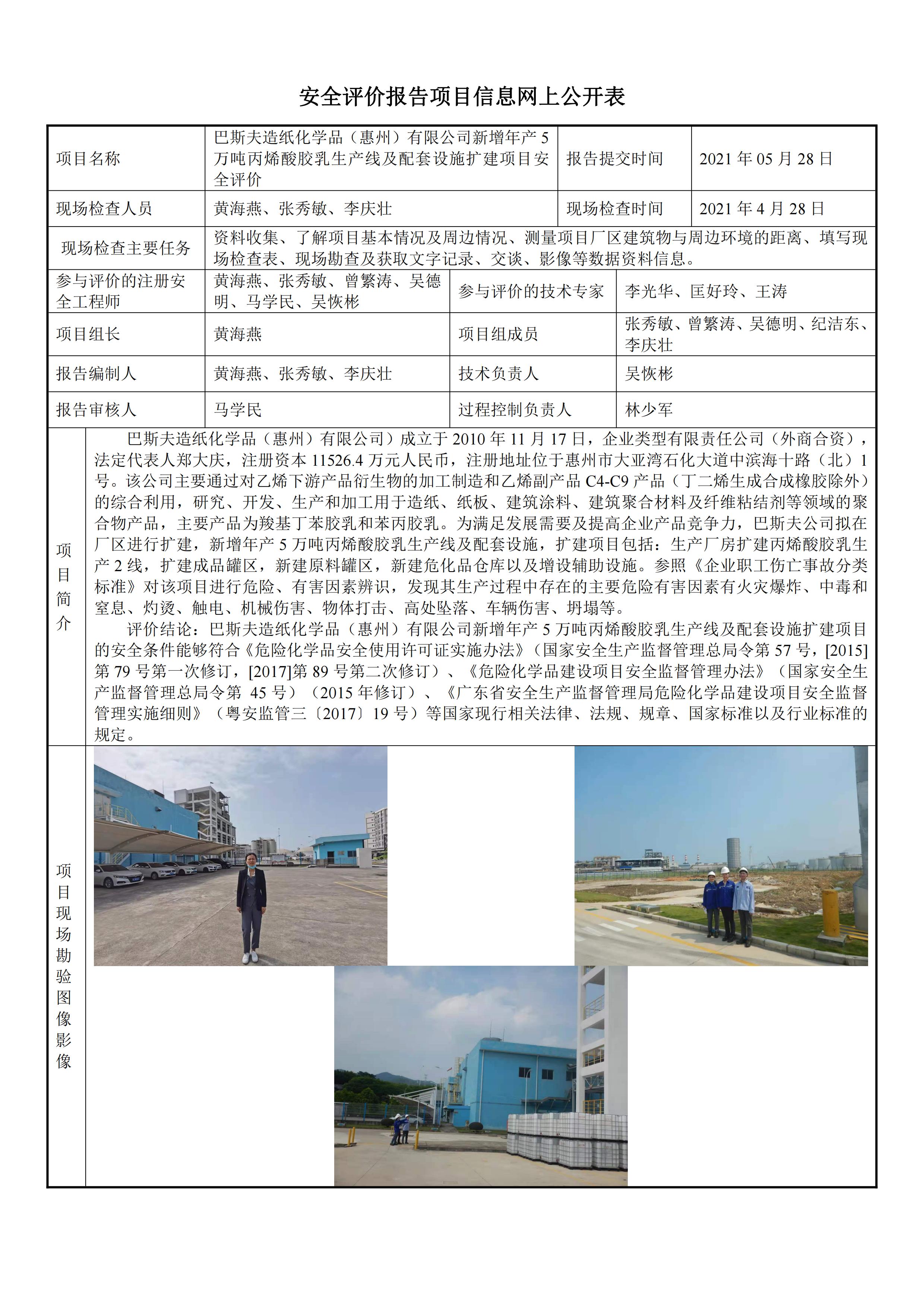 巴斯夫造纸化学品(惠州)有限公司新增年产5万吨丙烯酸胶乳生产线及配套设施扩建项目安全评价
