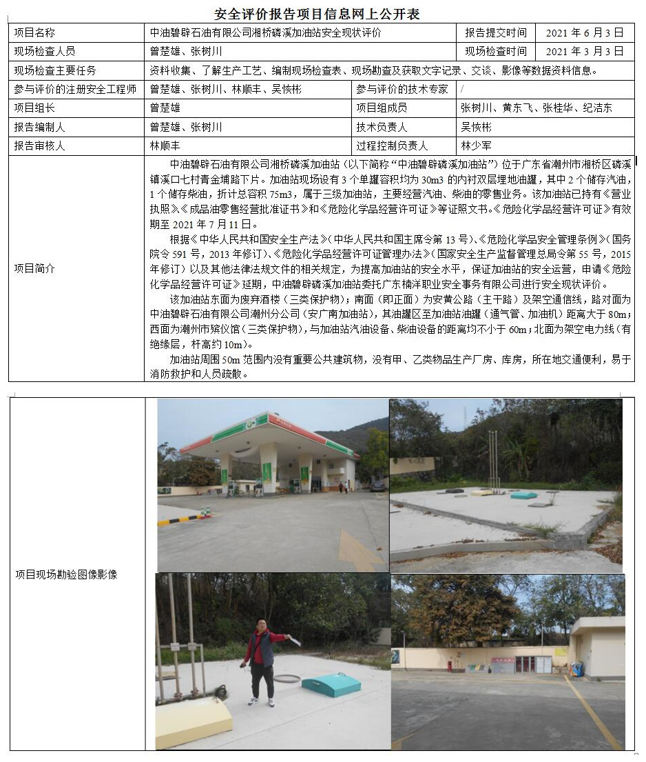 中油碧辟石油有限公司湘桥磷溪加油站安全现状评价