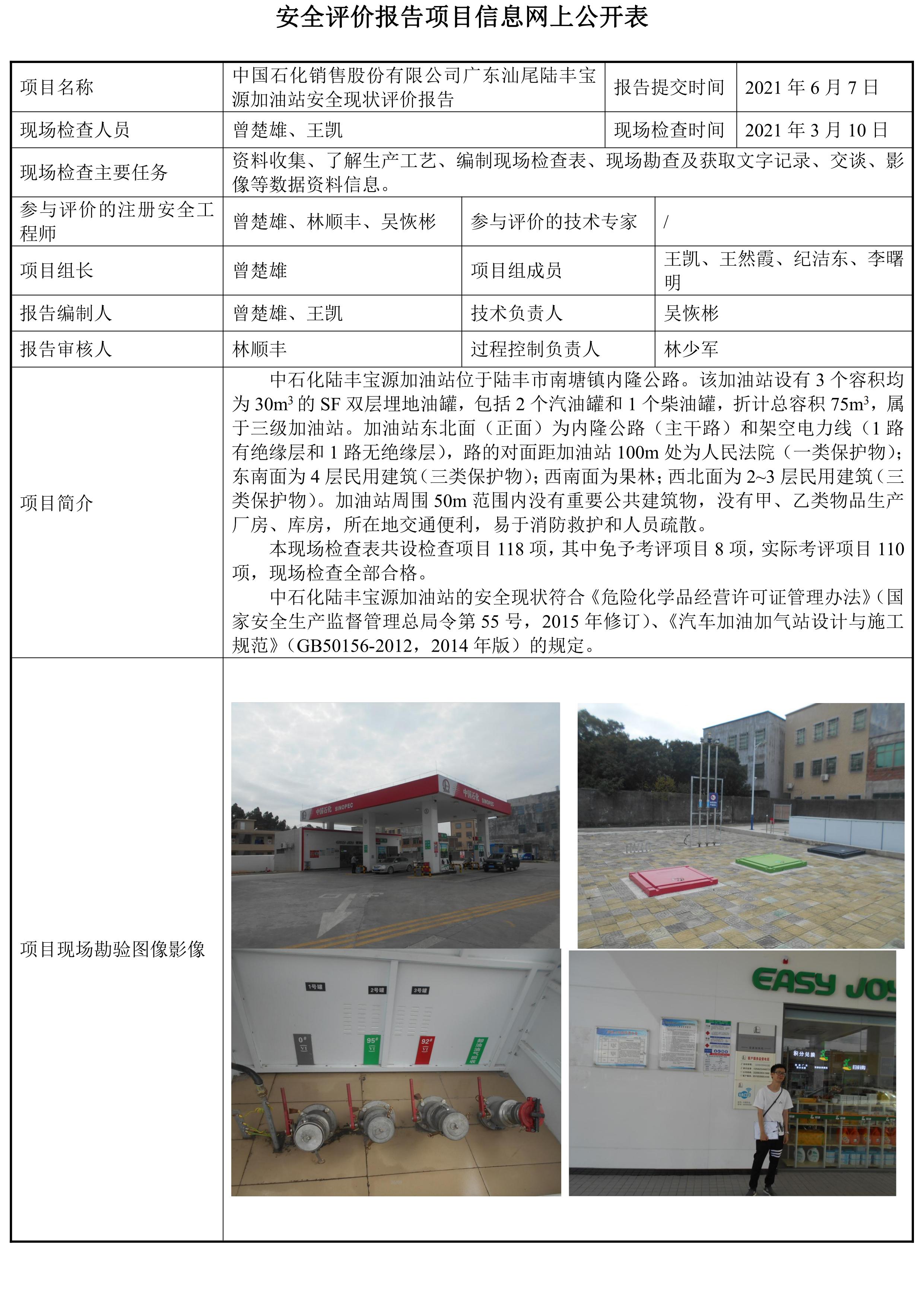 中国石化销售股份有限公司广东汕尾陆丰宝源加油站安全现状评价