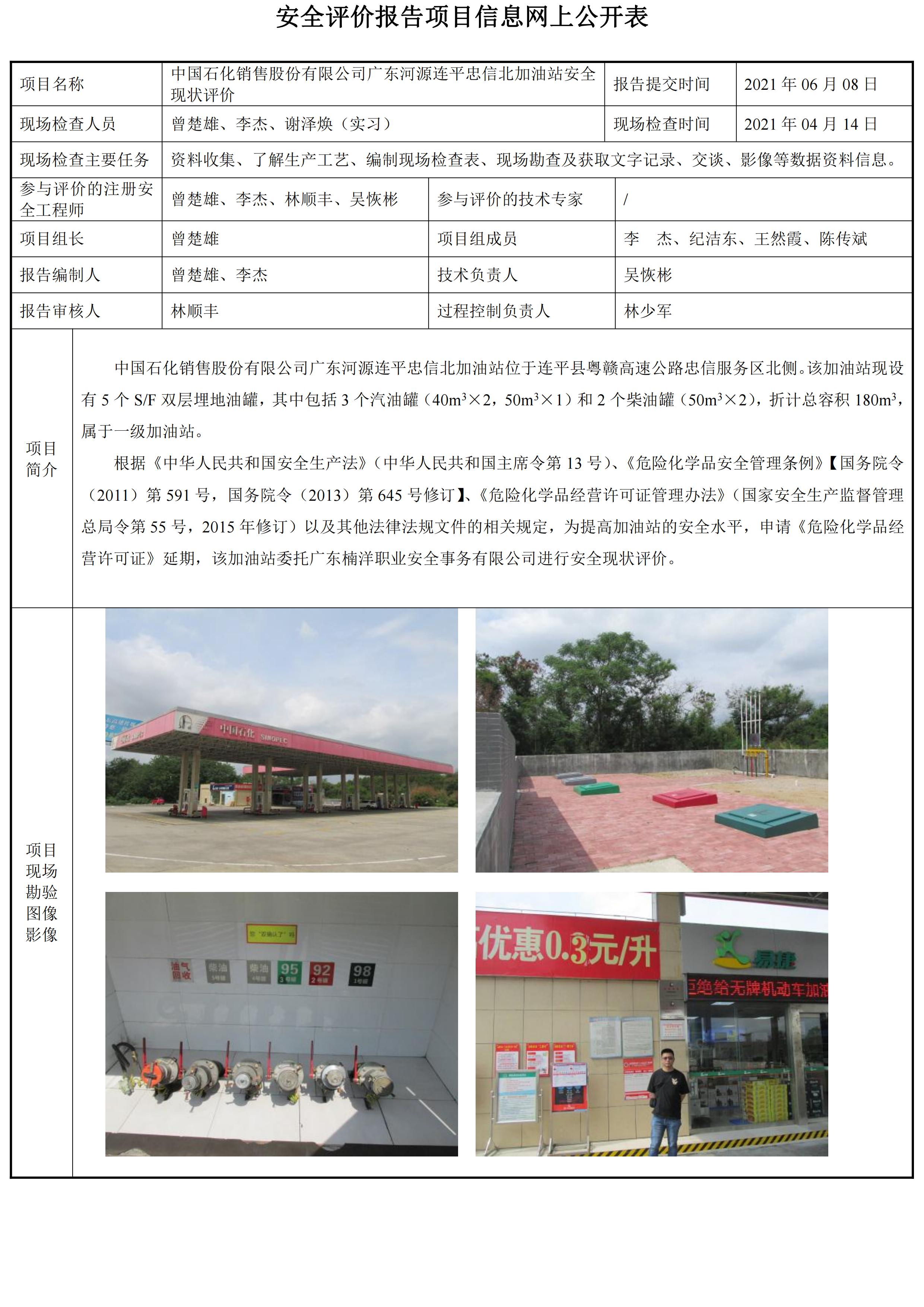中国石化销售股份有限公司广东河源连平忠信北加油站安全现状评价