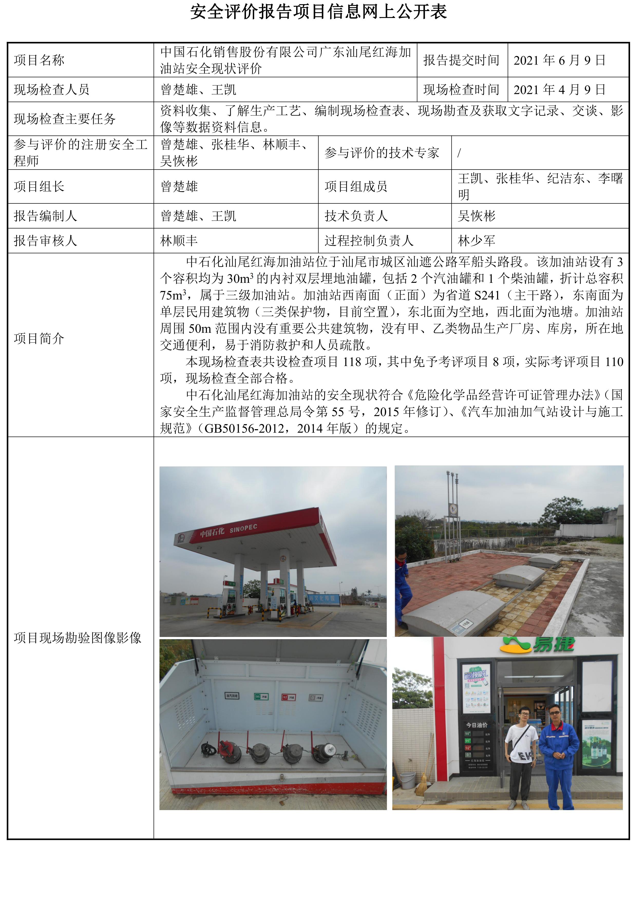 中国石化销售股份有限公司广东汕尾红海加油站安全现状评价