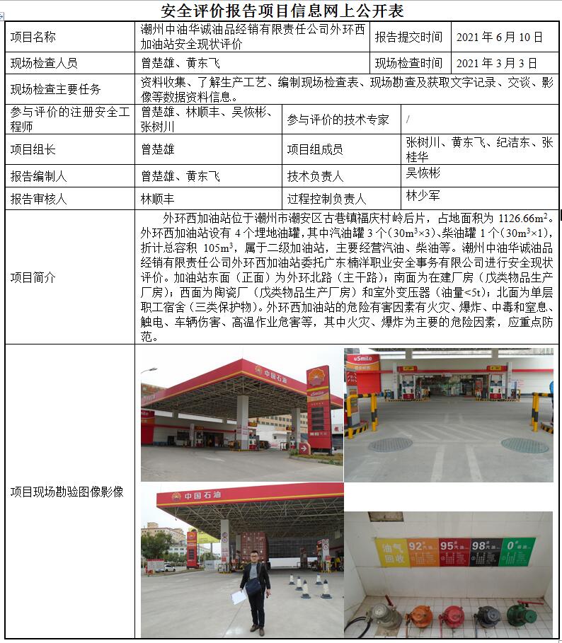 潮州中油华诚油品经销有限责任公司外环西加油站安全现状评价