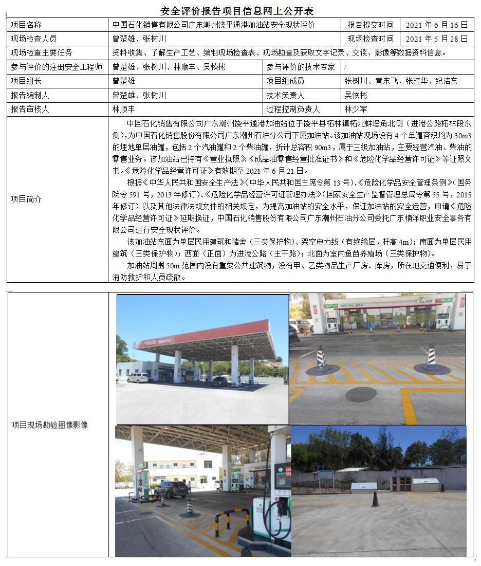 中国石化销售有限公司广东潮州饶平通港加油站安全现状评价