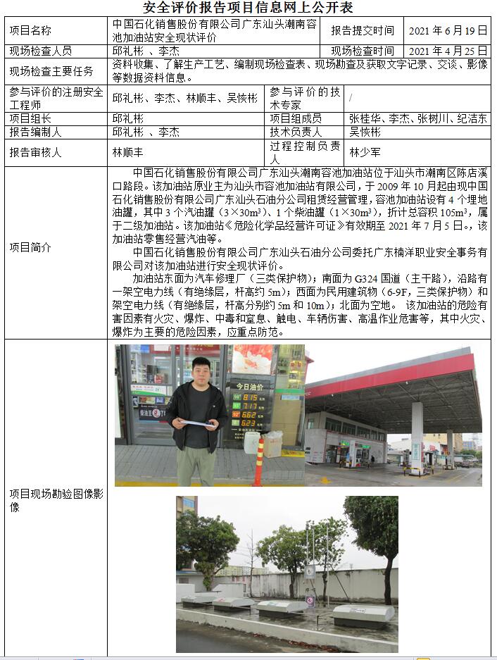 中国石化销售股份有限公司广东汕头潮南容池加油站安全现状评价