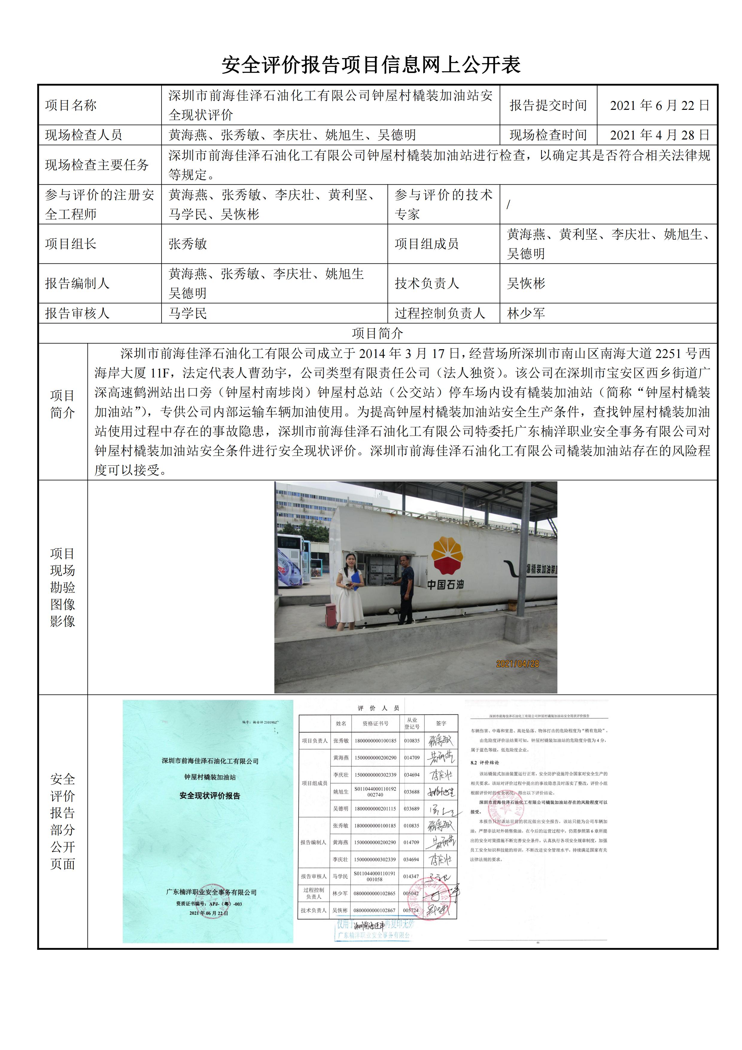 深圳市前海佳泽石油化工有限公司钟屋村橇装加油站安全现状评价报告