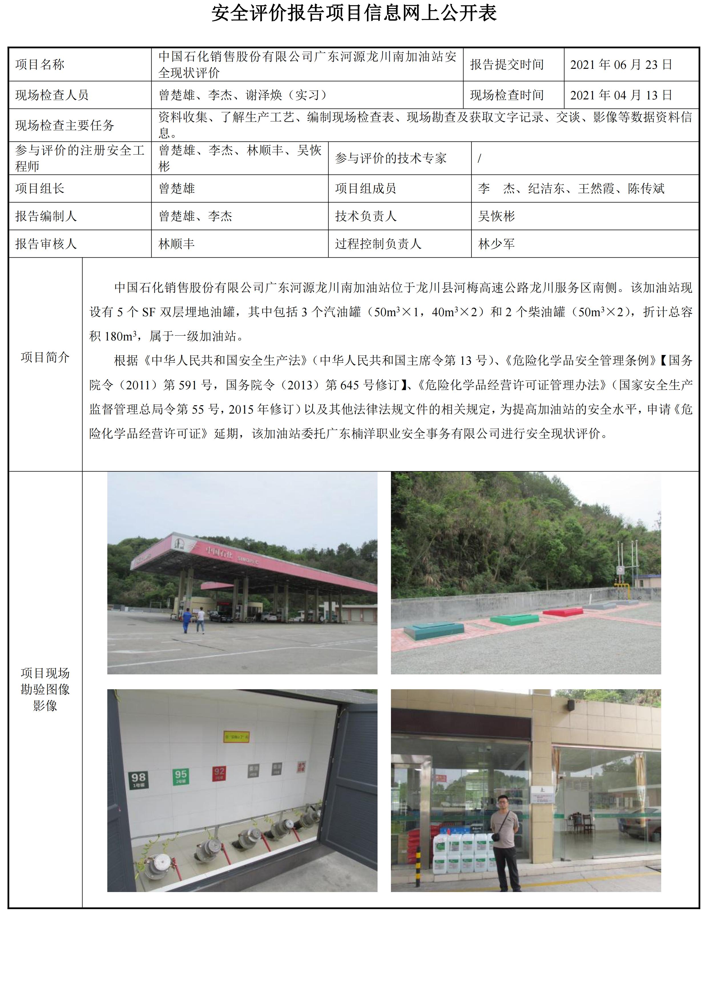 中国石化销售股份有限公司广东河源龙川南加油站安全现状评价