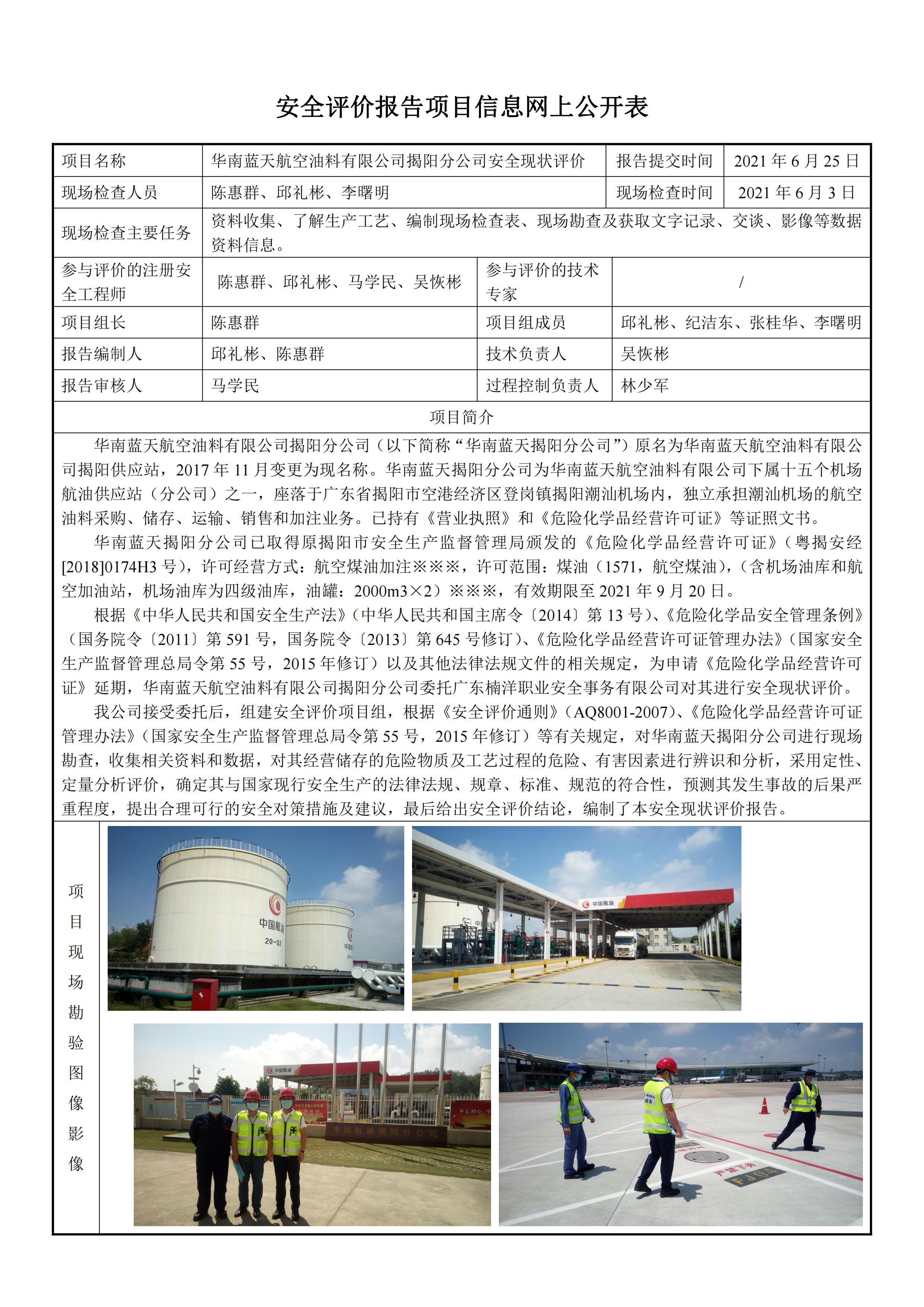华南蓝天航空油料有限公司揭阳分公司安全现状评价