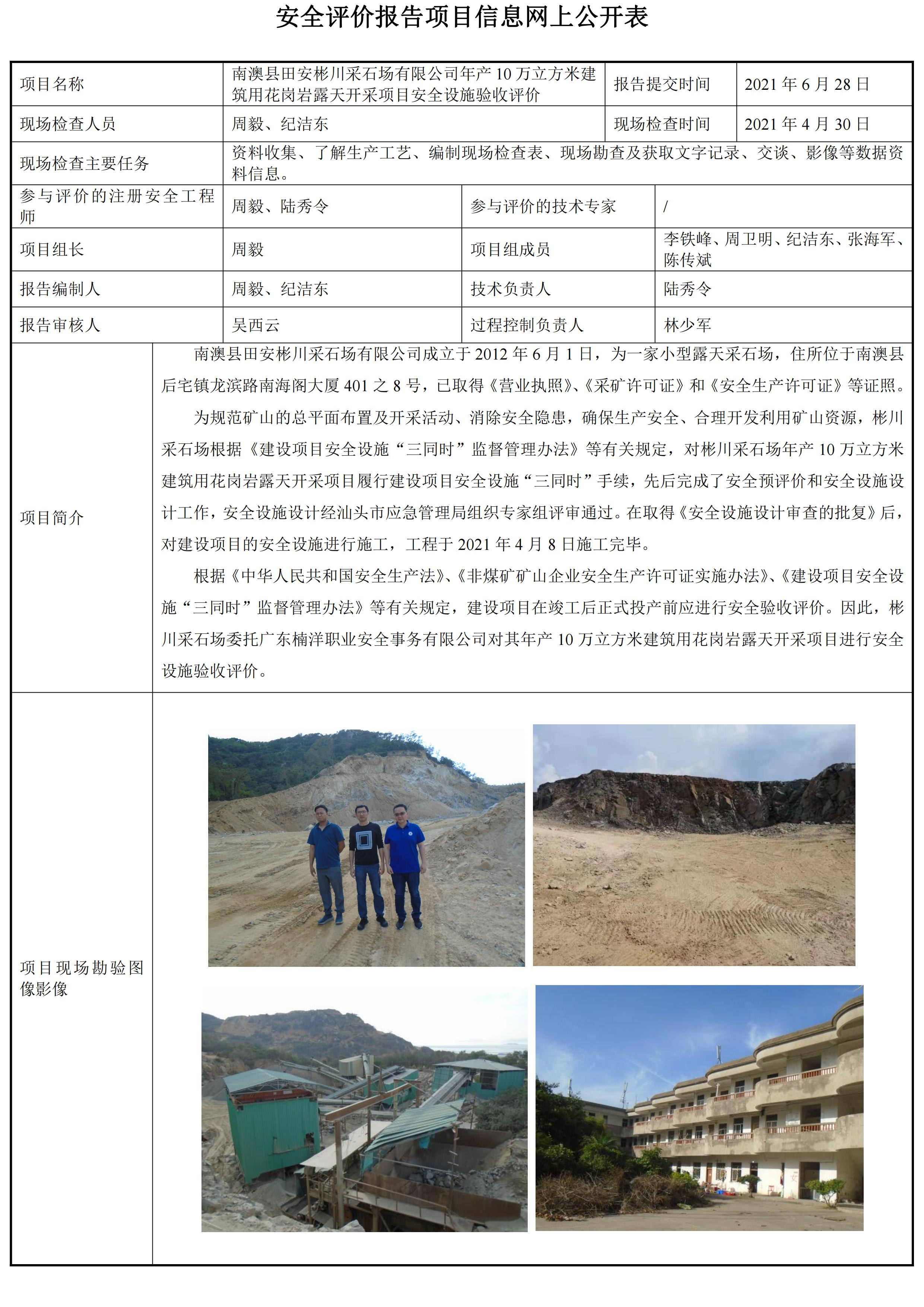 南澳县田安彬川采石场有限公司年产10万立方米建筑用花岗岩露天开采项目安全设施验收评价