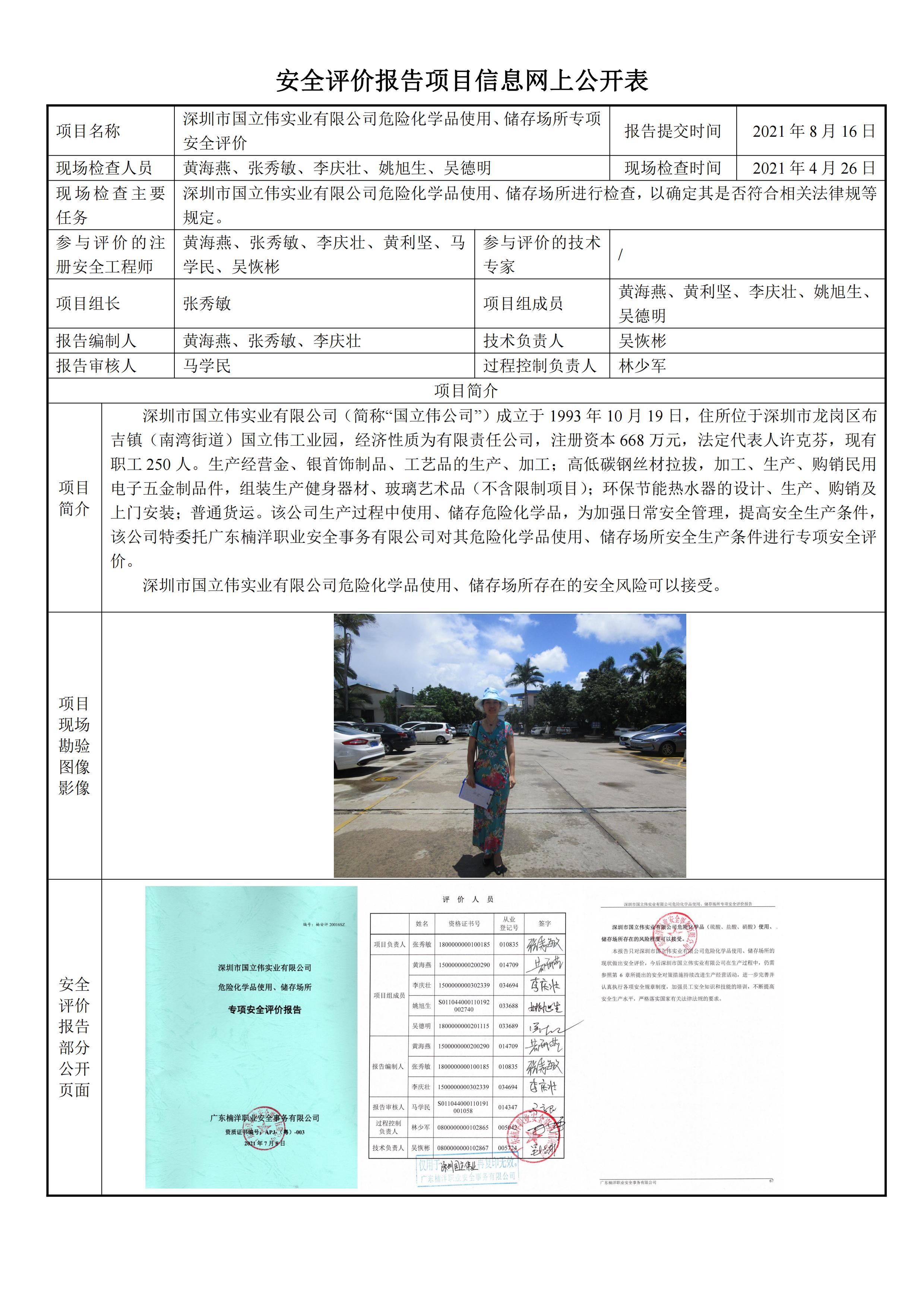 深圳市国立伟实业有限公司危险化学品使用、储存场所专项安全评价报告