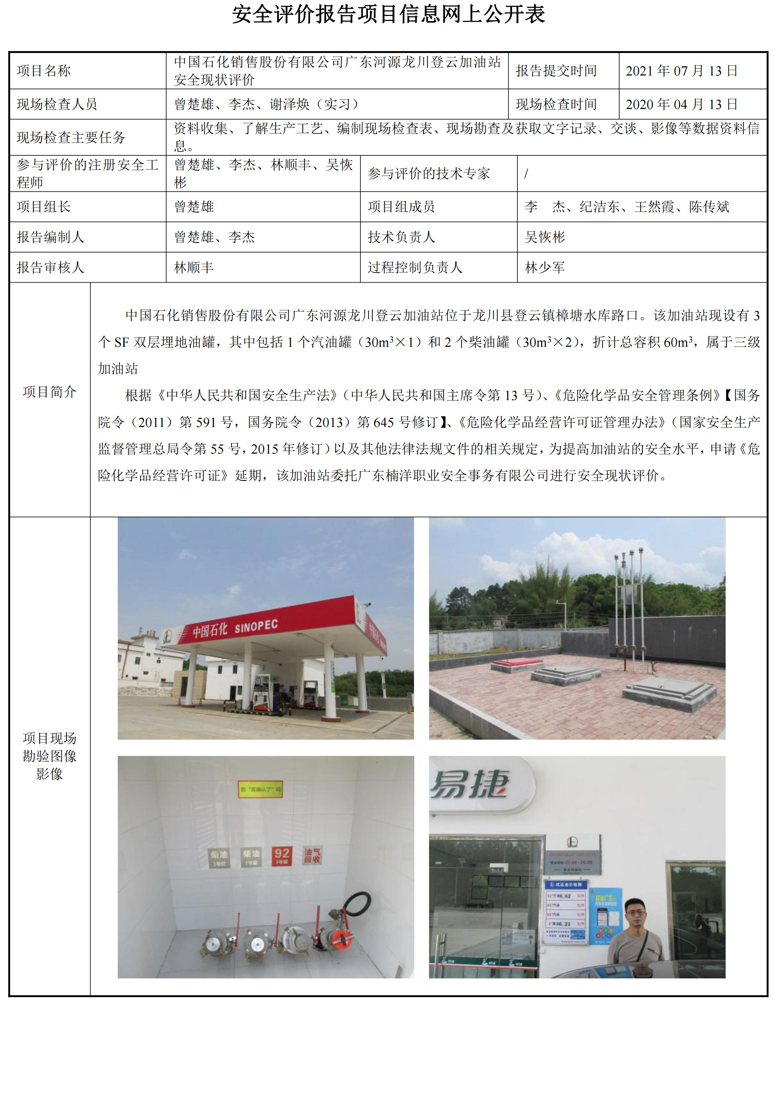 中国石化销售股份有限公司广东河源龙川登云加油站安全现状评价