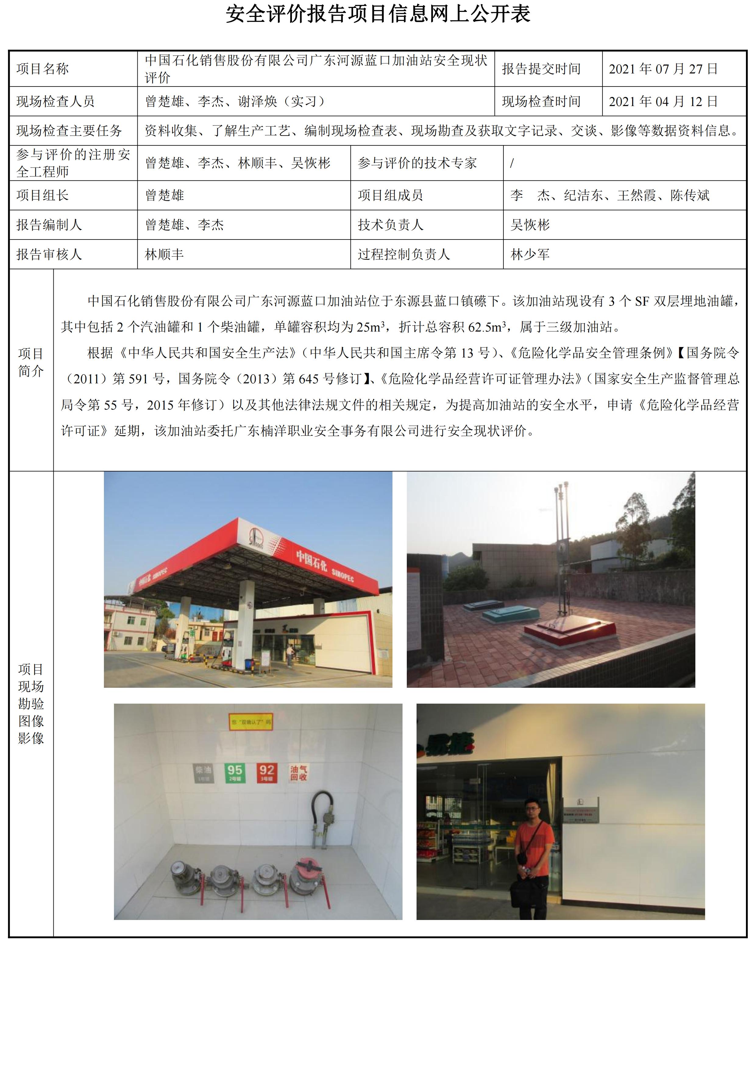 中国石化销售股份有限公司广东河源蓝口加油站安全现状评价