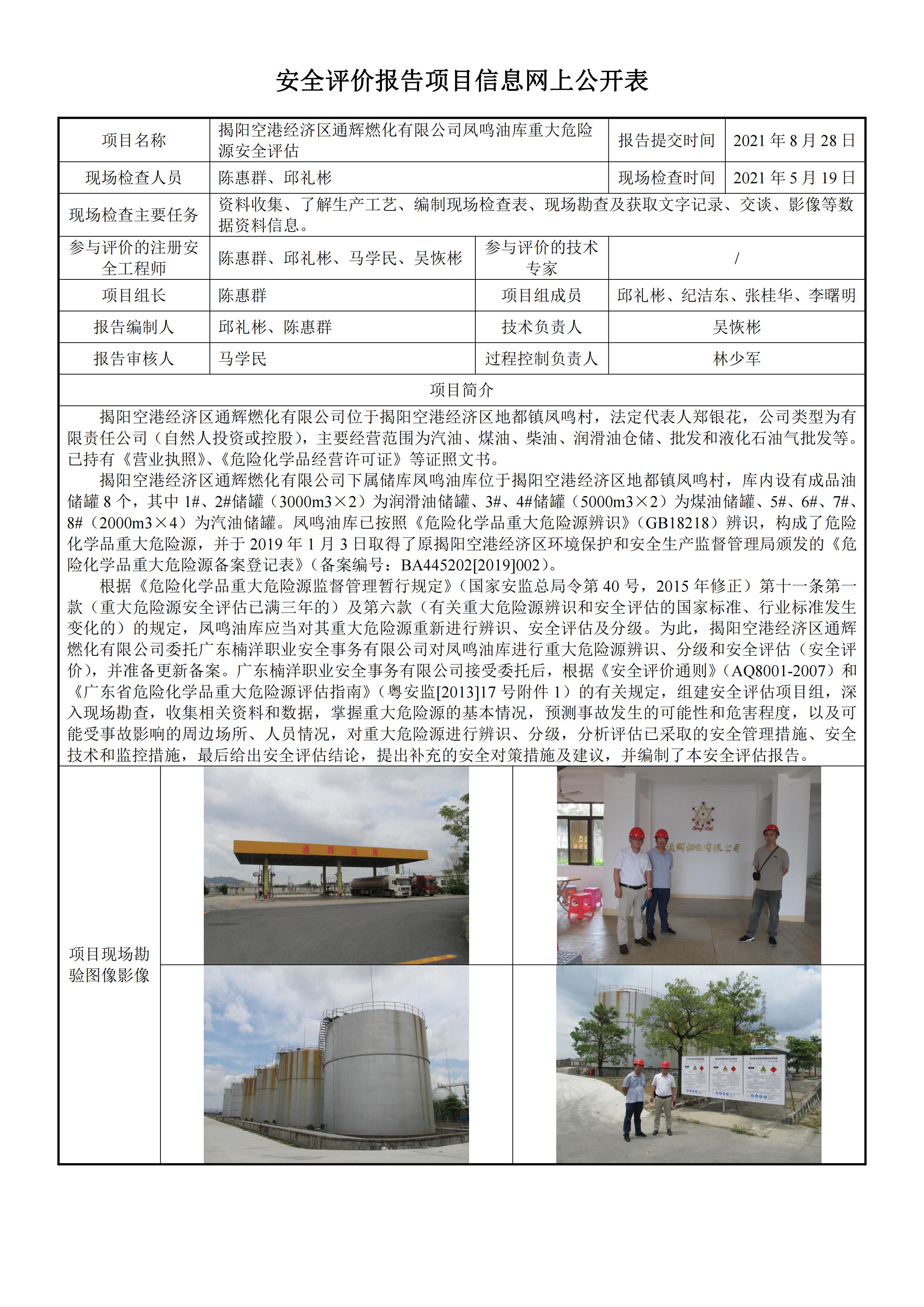 揭阳空港经济区通辉燃化有限公司凤鸣油库重大危险源安全评估