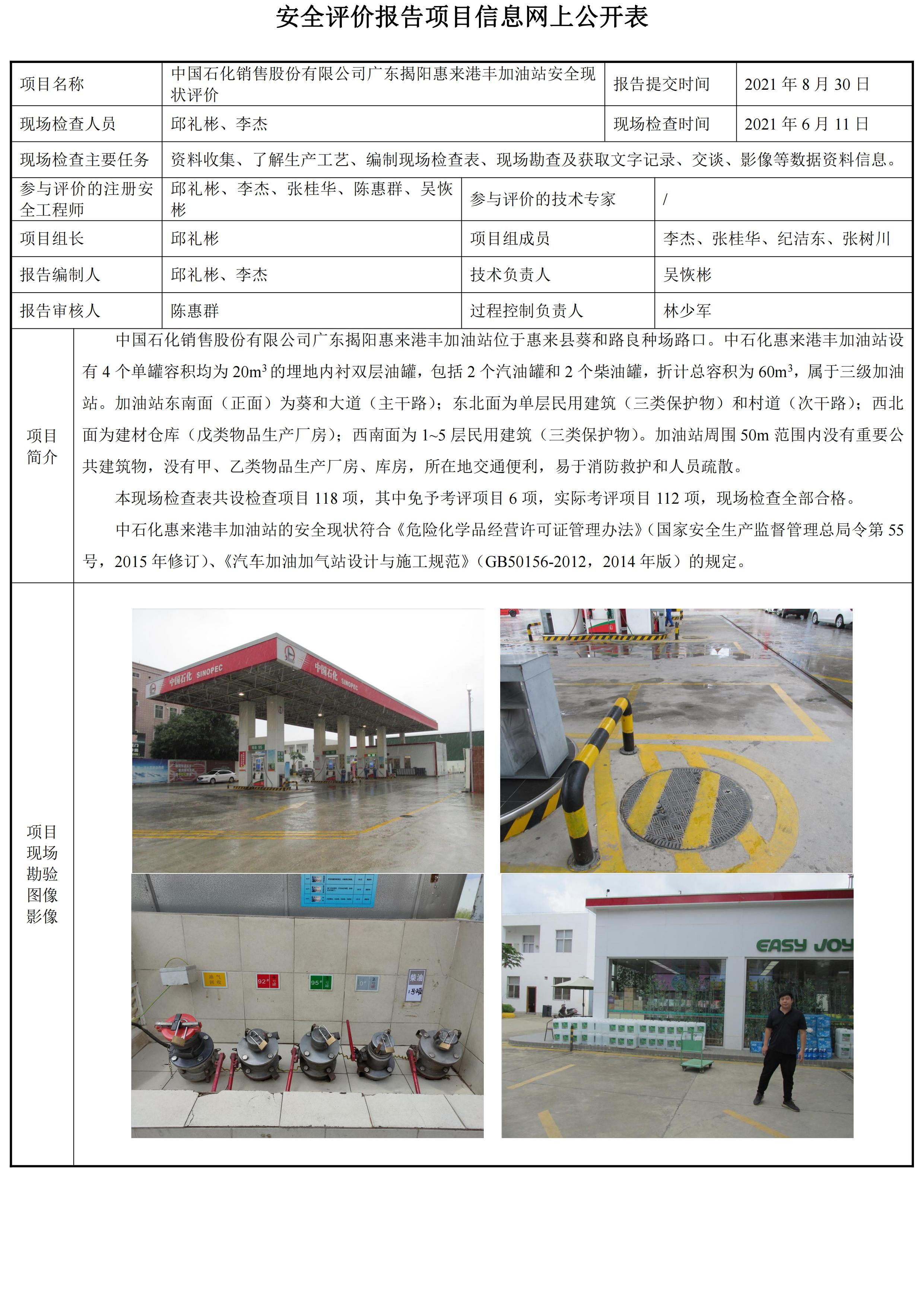 中国石化销售股份有限公司广东揭阳惠来港丰加油站安全现状评价