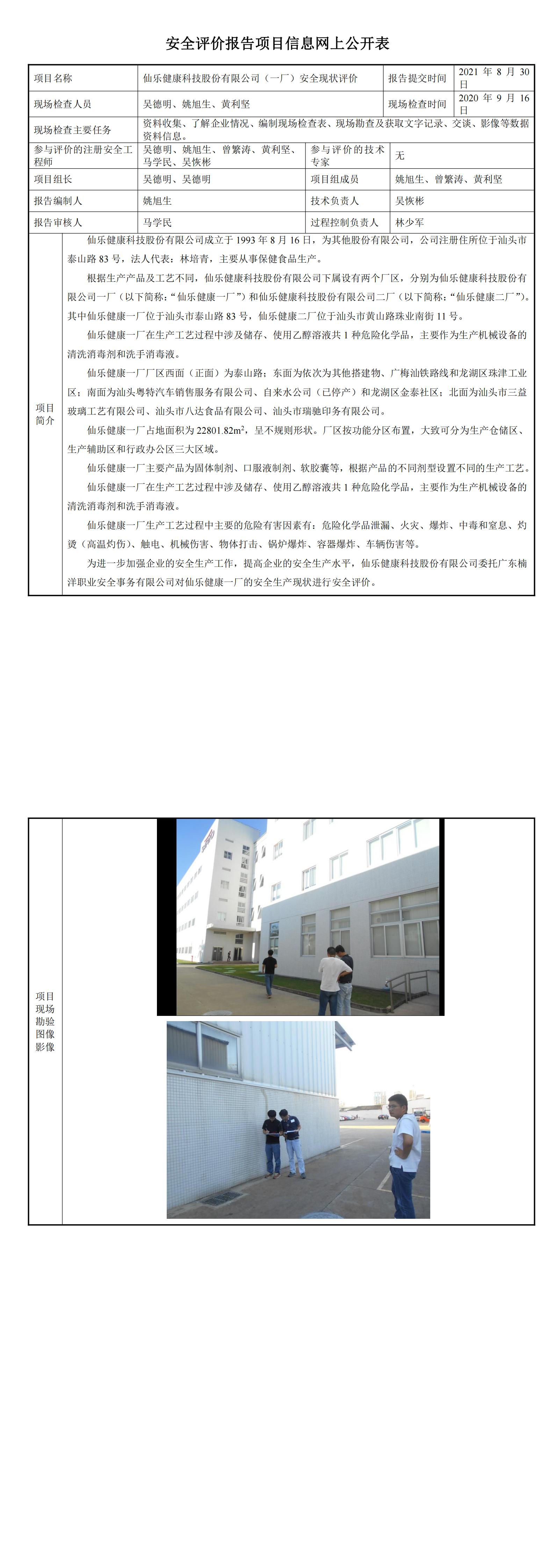 仙乐健康科技股份有限公司(一厂)安全现状评价报告