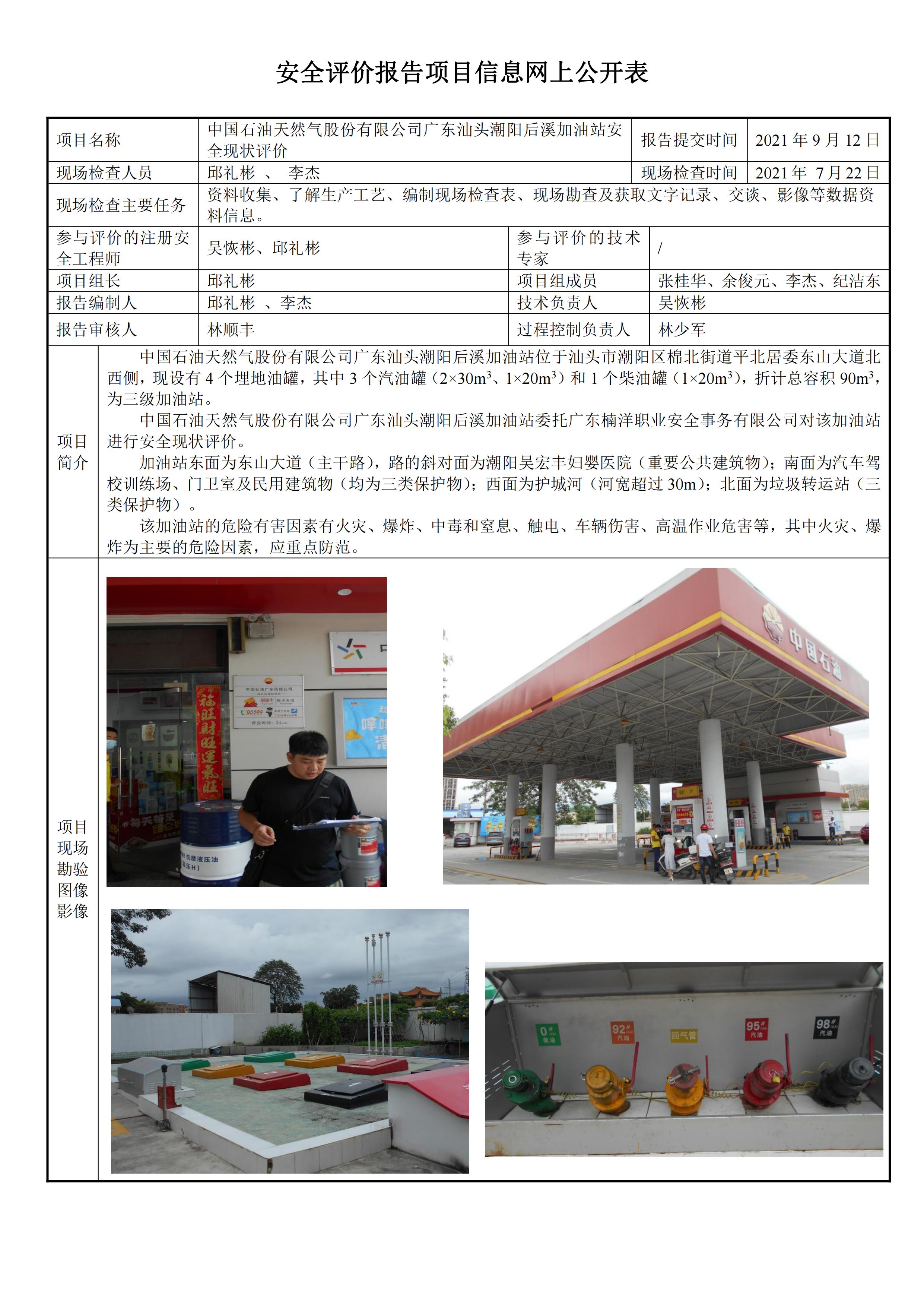 中国石油天然气股份有限公司广东汕头潮阳后溪加油站安全现状评价