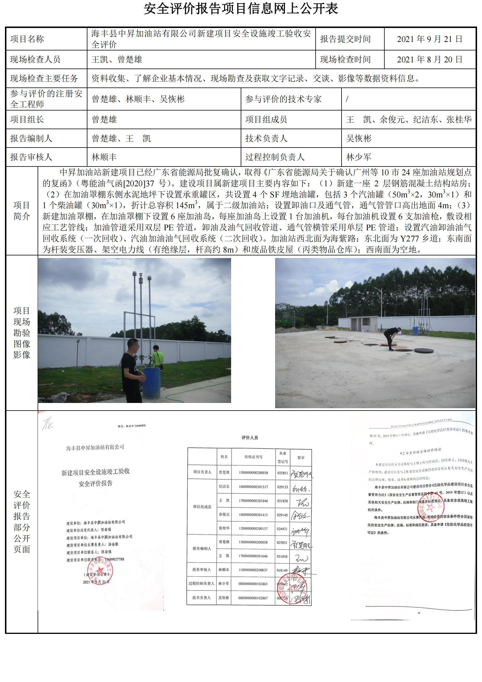 海丰县中昇加油站有限公司新建项目安全设施竣工验收安全评价