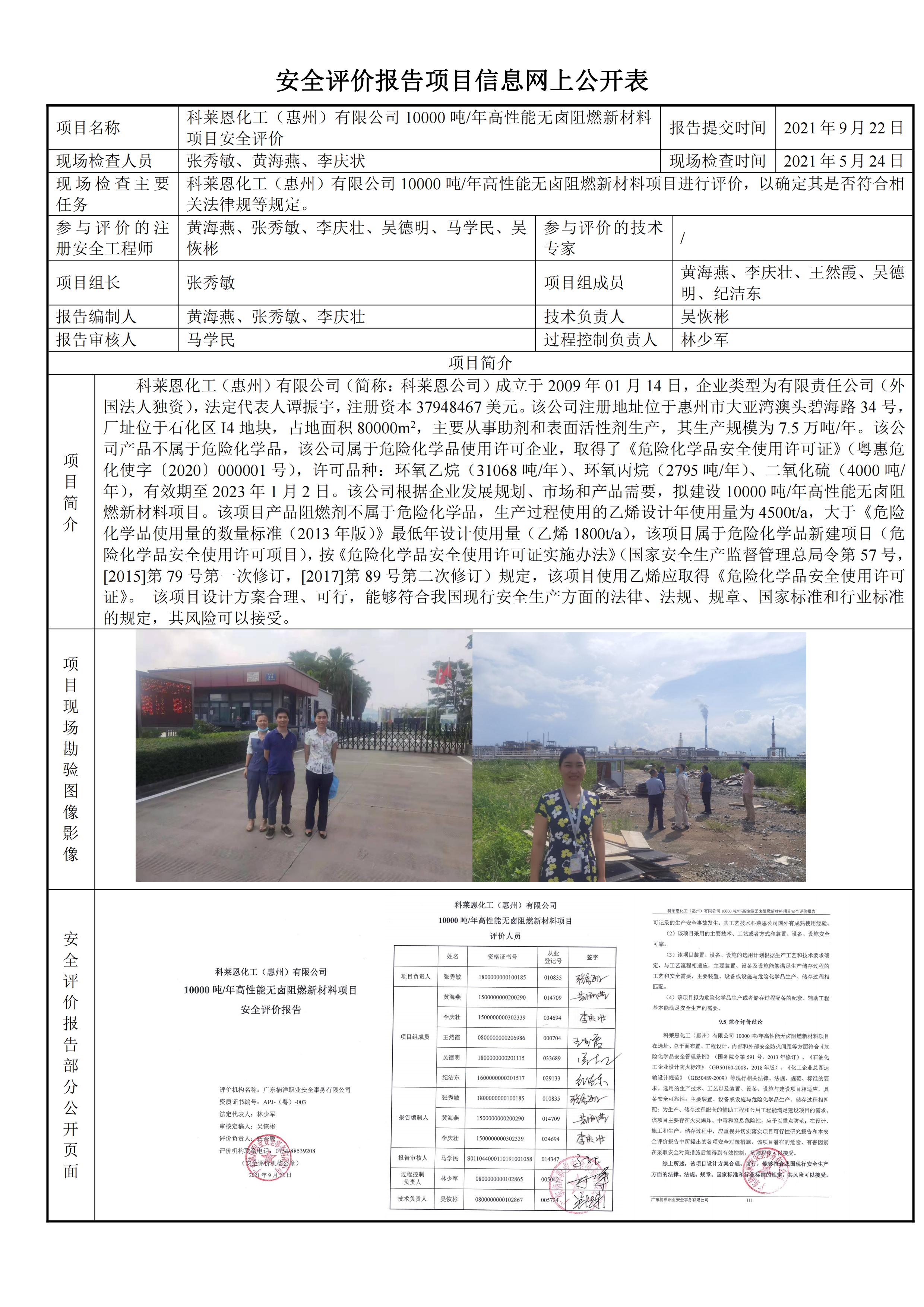 科莱恩化工(惠州)有限公司10000吨/年高性能无卤阻燃新材料项目安全评价报告