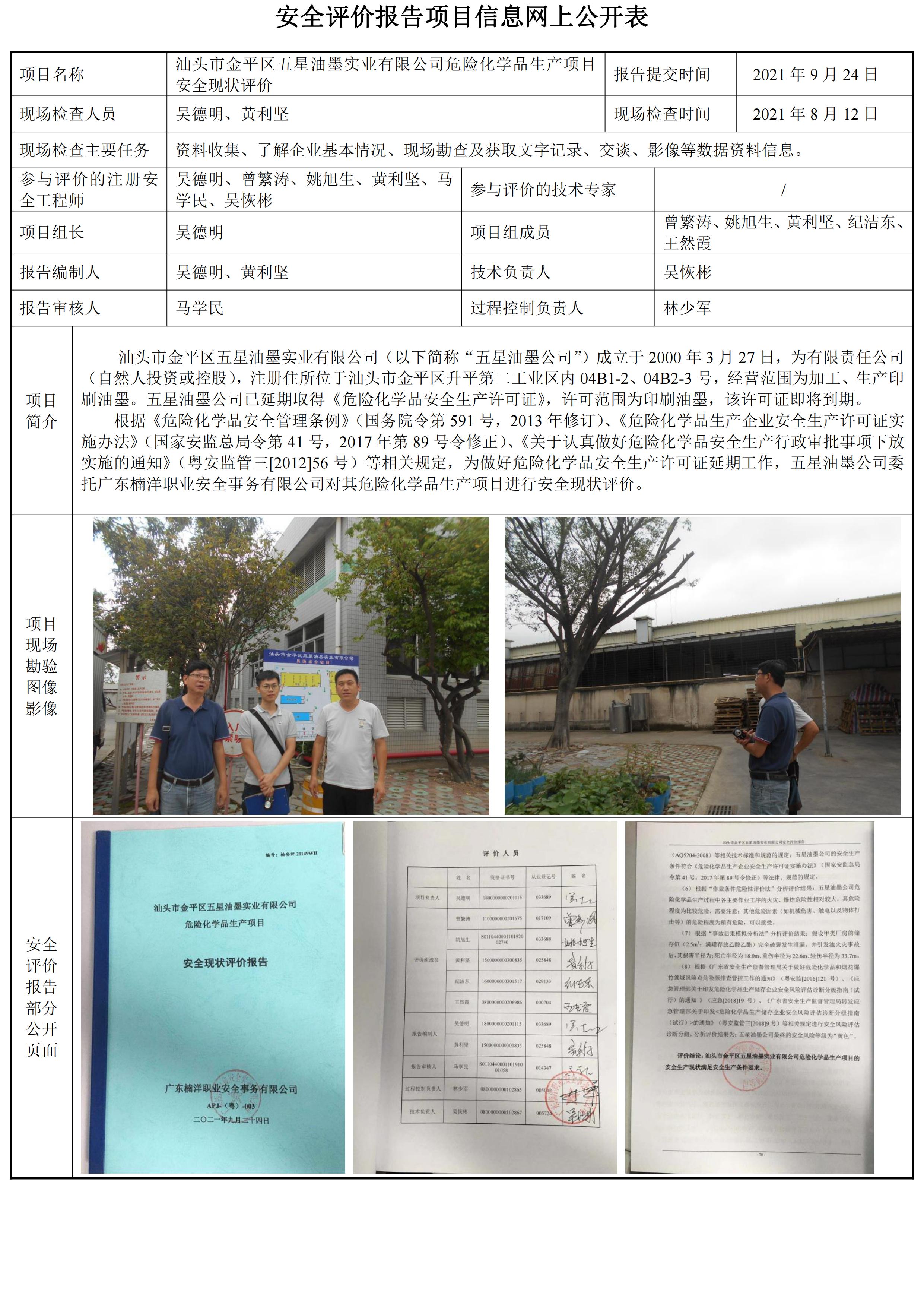 汕头市金平区五星油墨实业有限公司危险化学品生产项目安全现状评价