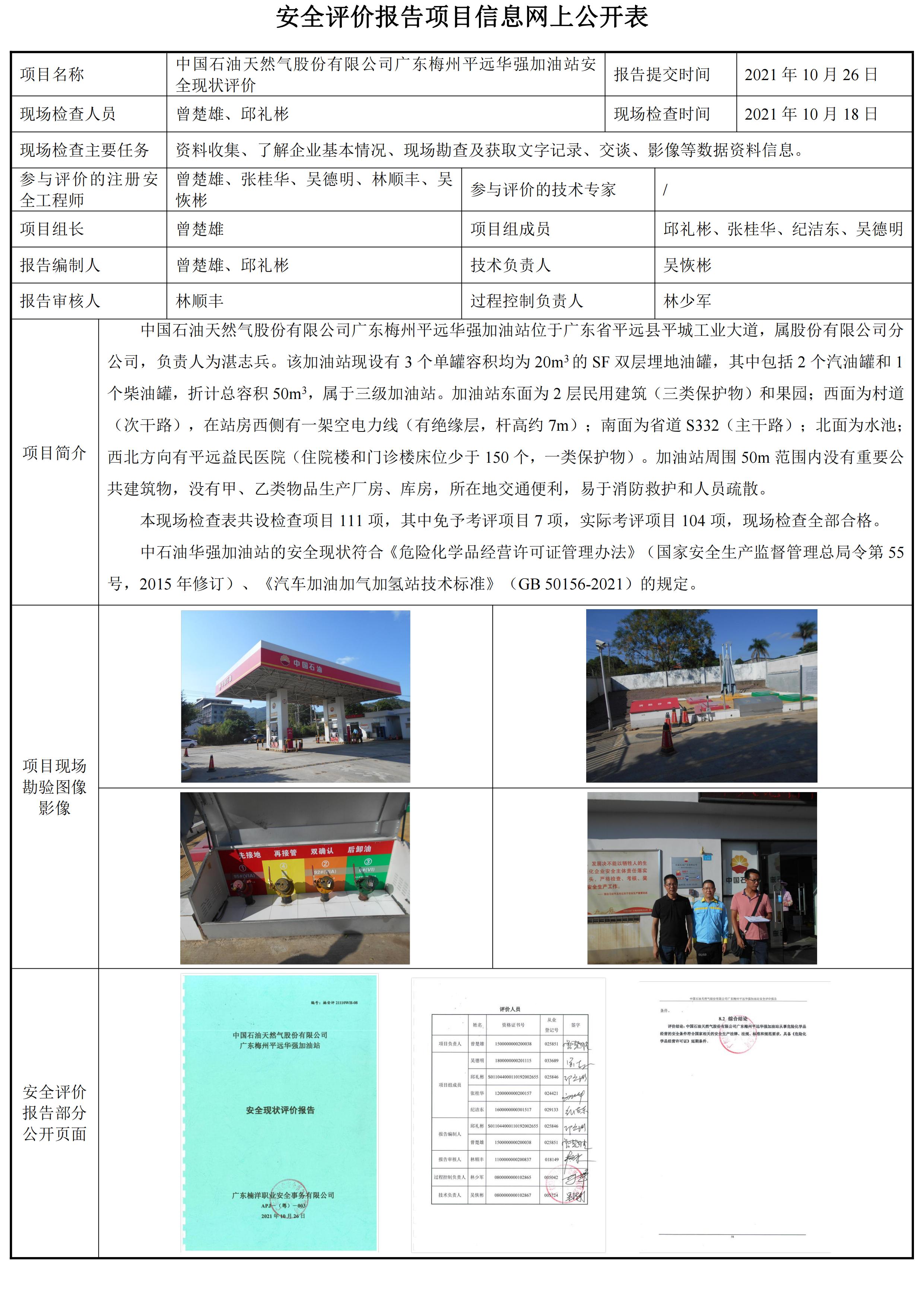 中国石油天然气股份有限公司广东梅州平远华强加油站安全现状评价