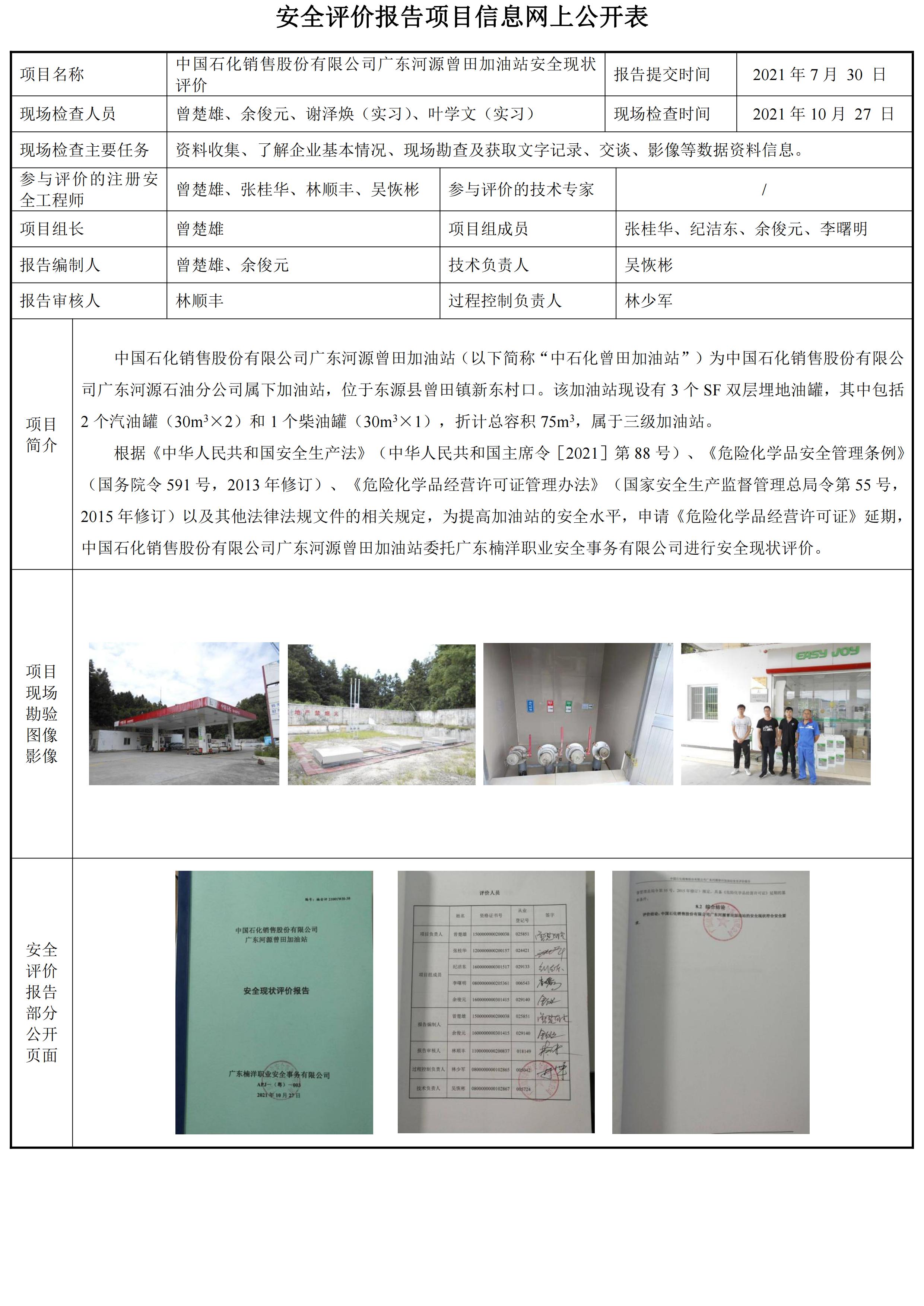 中国石化销售股份有限公司广东河源曾田加油站安全现状评价