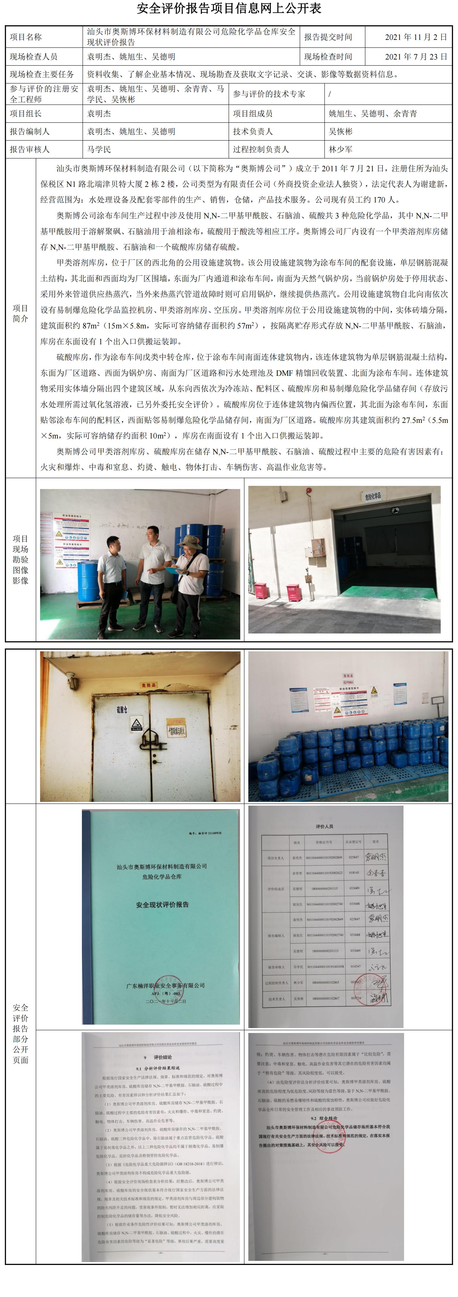 汕头市奥斯博环保材料制造有限公司危险化学品仓库安全现状评价报告