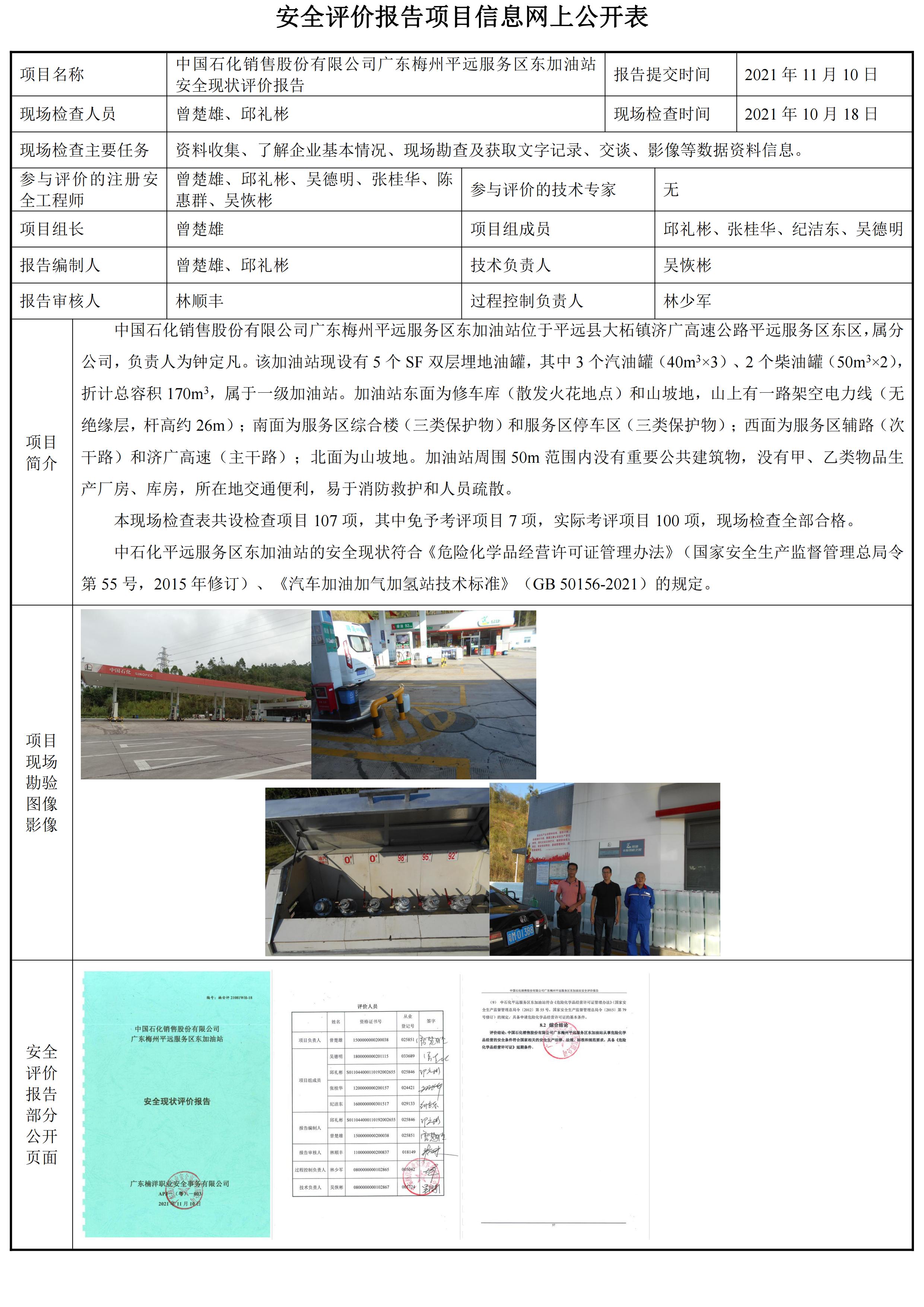 中国石化销售股份有限公司广东梅州平远服务区东加油站安全现状评价