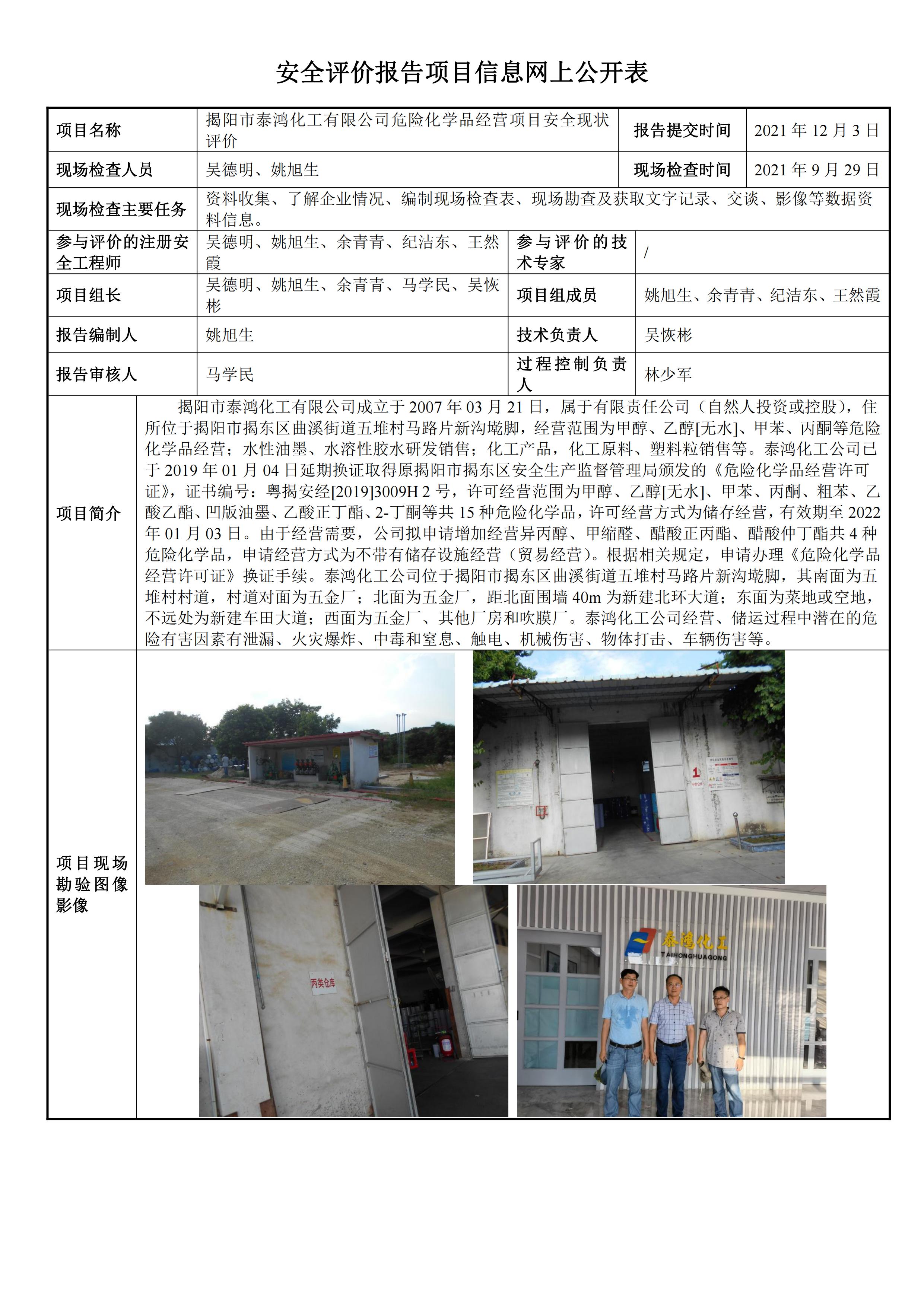 揭阳市泰鸿化工有限公司经营危险化学品安全现状评价