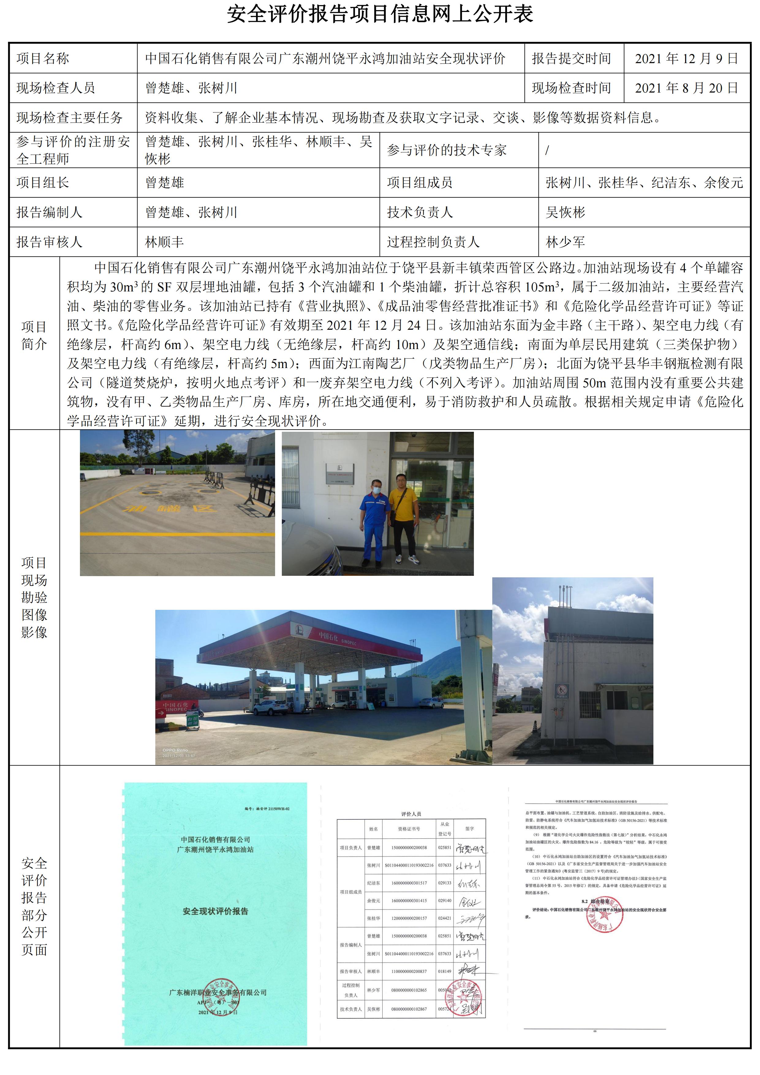 中国石化销售有限公司广东潮州饶平永鸿加油站安全现状评价