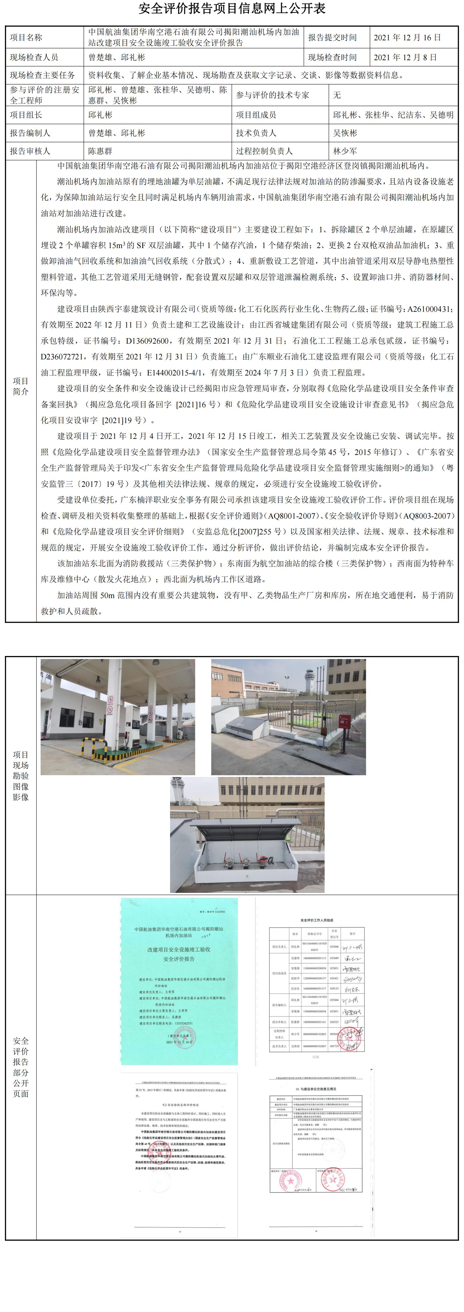 中国航油集团华南空港石油有限公司揭阳潮汕机场内加油站改建项目安全设施竣工验收安全评价报告