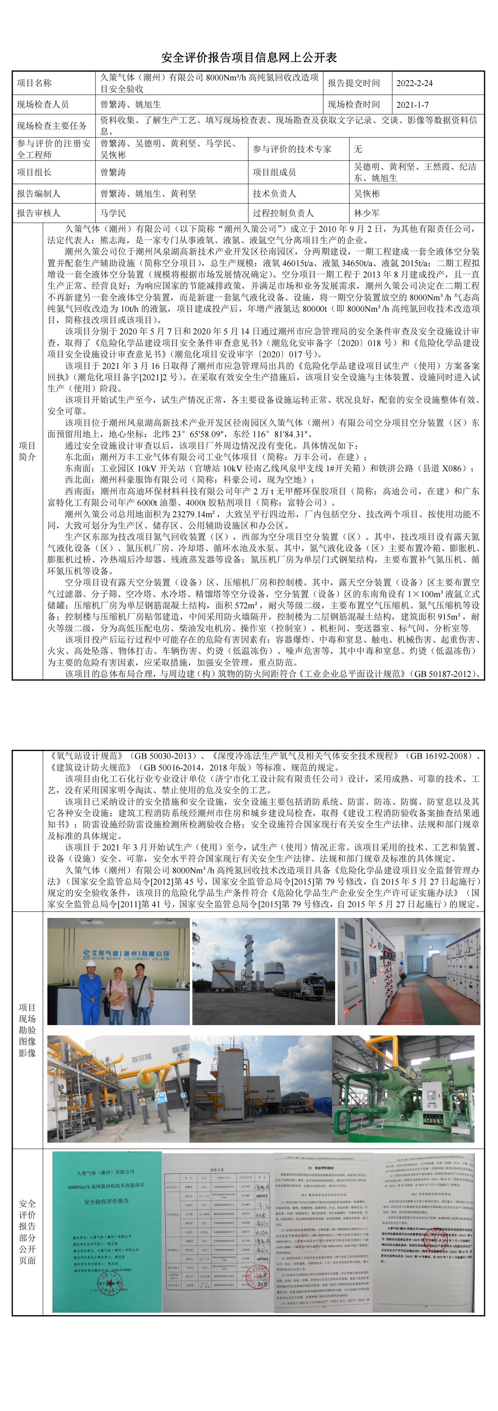 久策气体(潮州)有限公司8000Nm³/h高纯氮回收技术改造项目安全验收评价报告