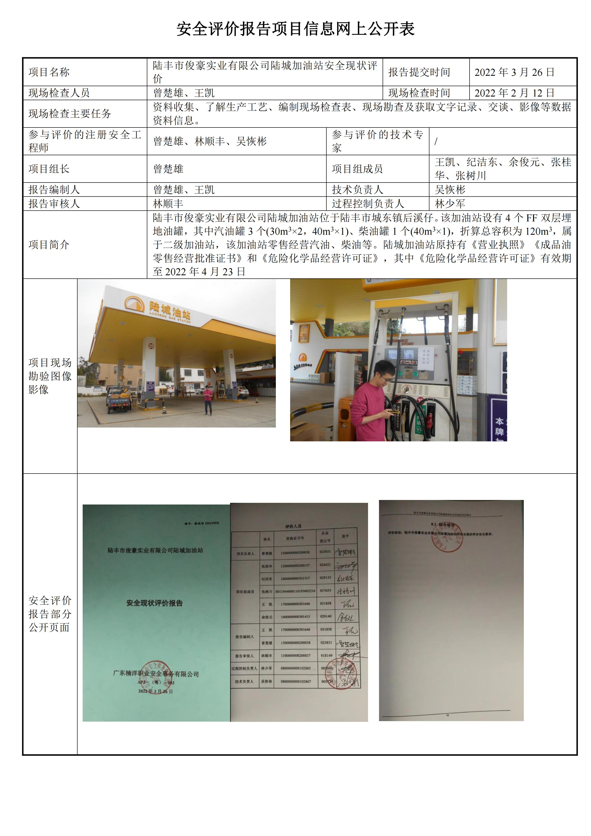 陆丰市俊豪实业有限公司陆城加油站安全现状评价报告