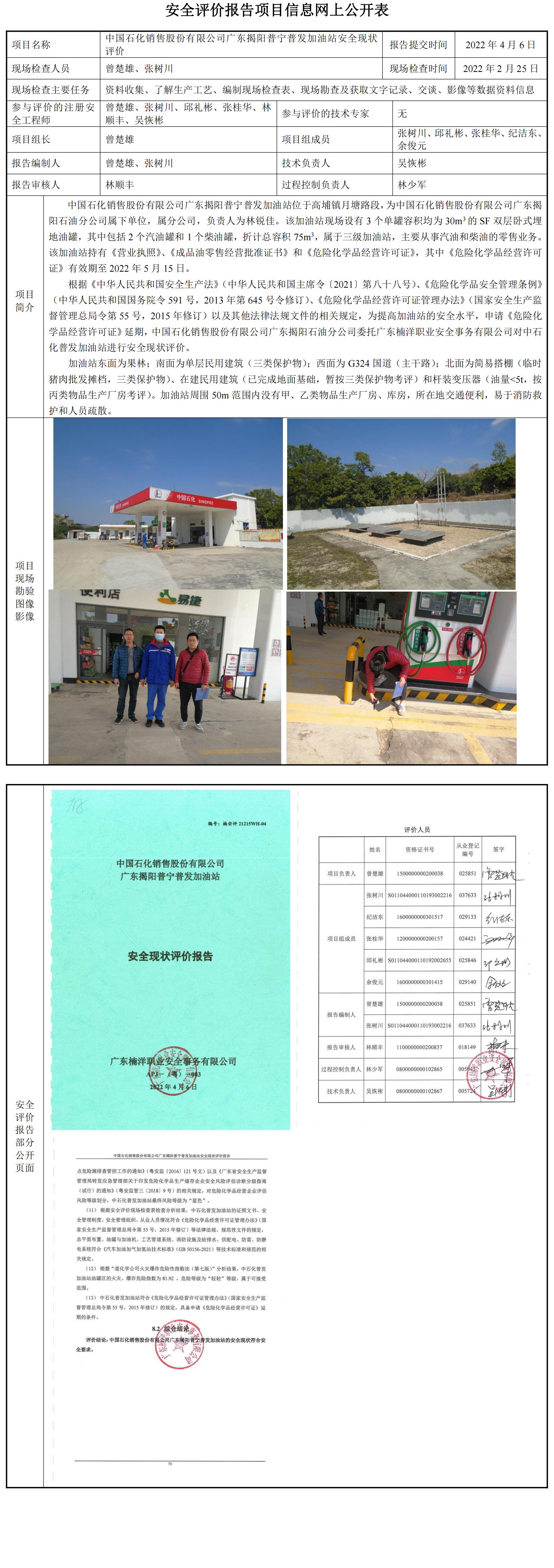 中国石化销售股份有限公司广东揭阳普宁普发加油站安全现状评价报告