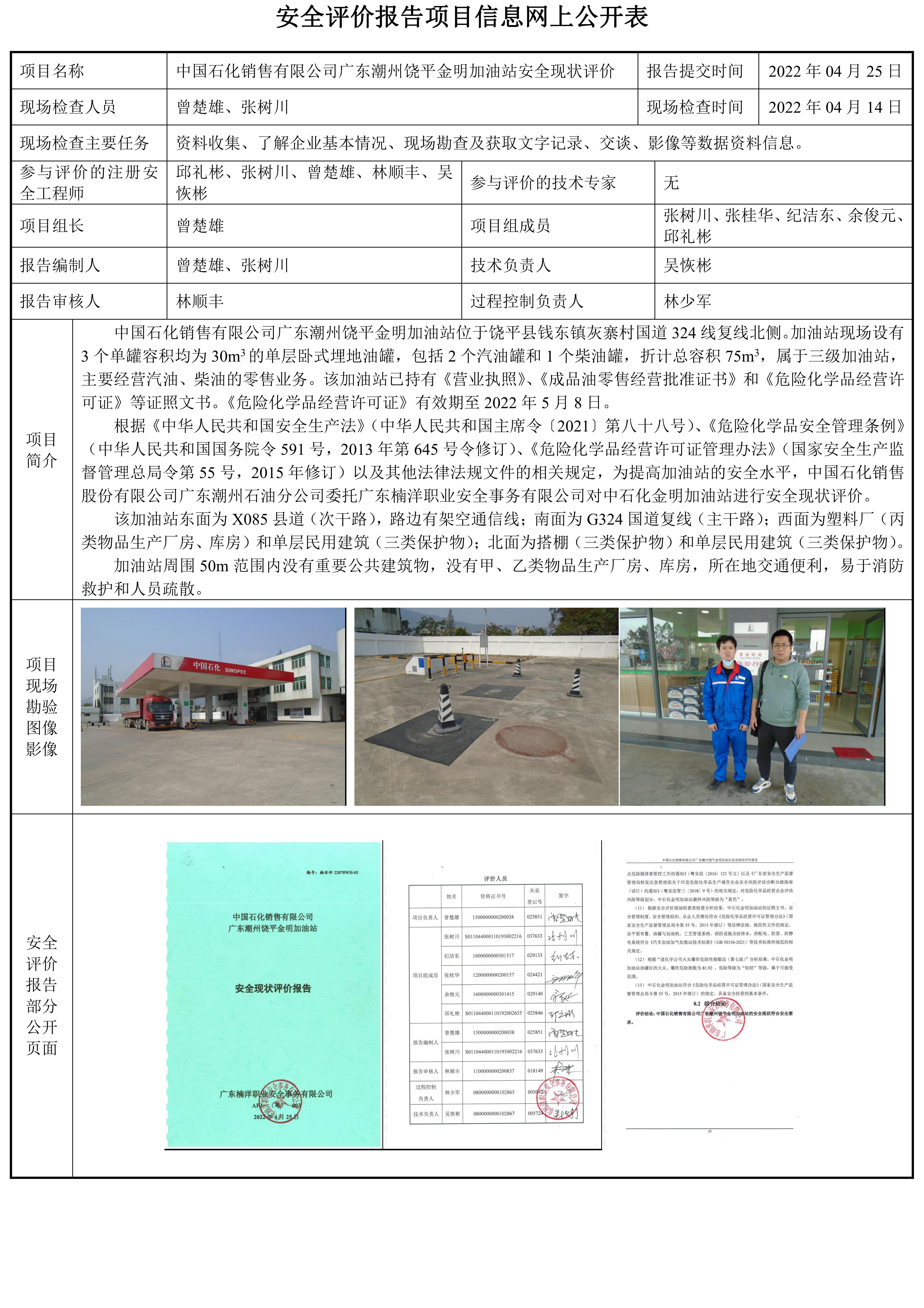中国石化销售有限公司广东潮州饶平金明加油站安全现状评价报告