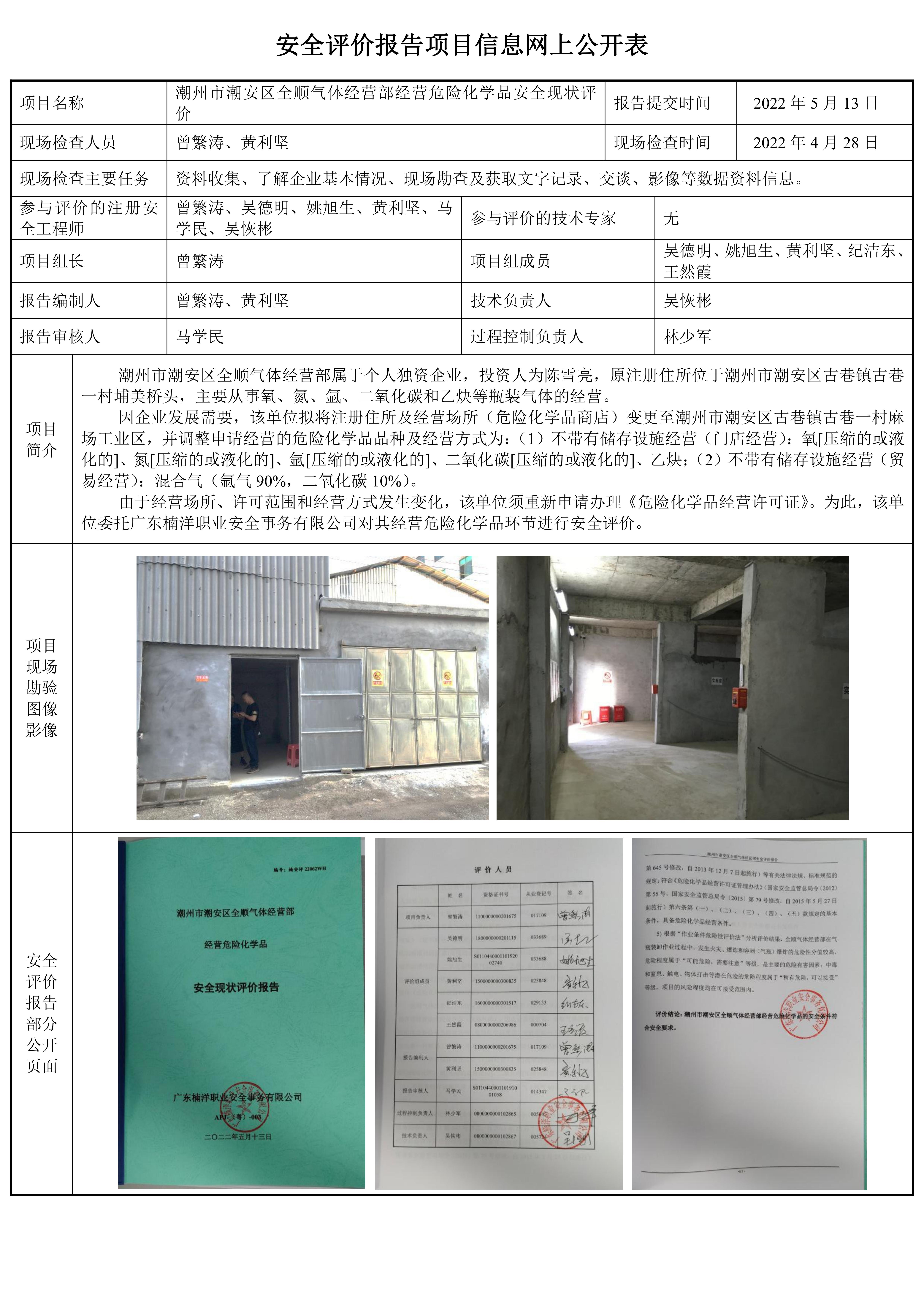 潮州市潮安区全顺气体经营部经营危险化学品安全现状评价报告