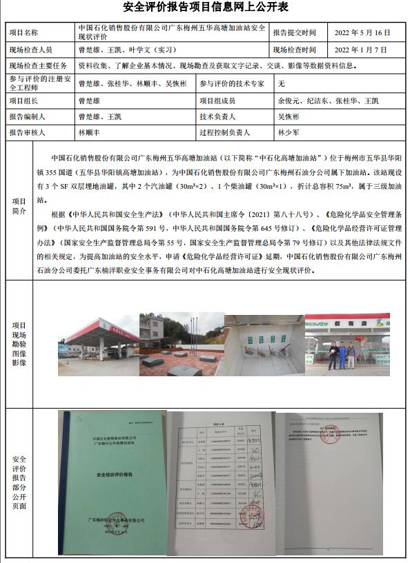 中国石化销售股份有限公司广东梅州五华高塘加油站安全现状评价报告