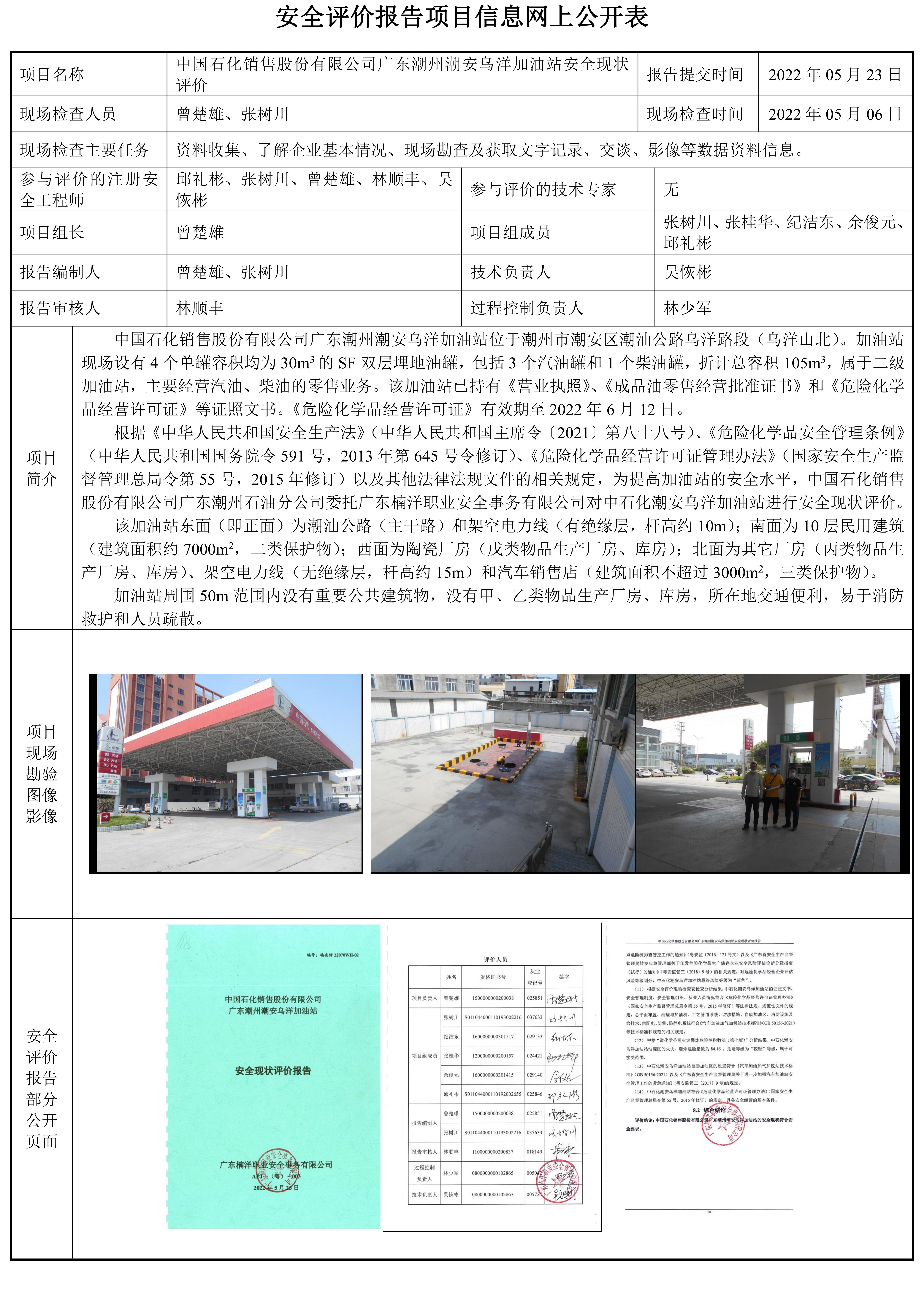 中国石化销售股份有限公司广东潮州潮安乌洋加油站安全现状评价报告