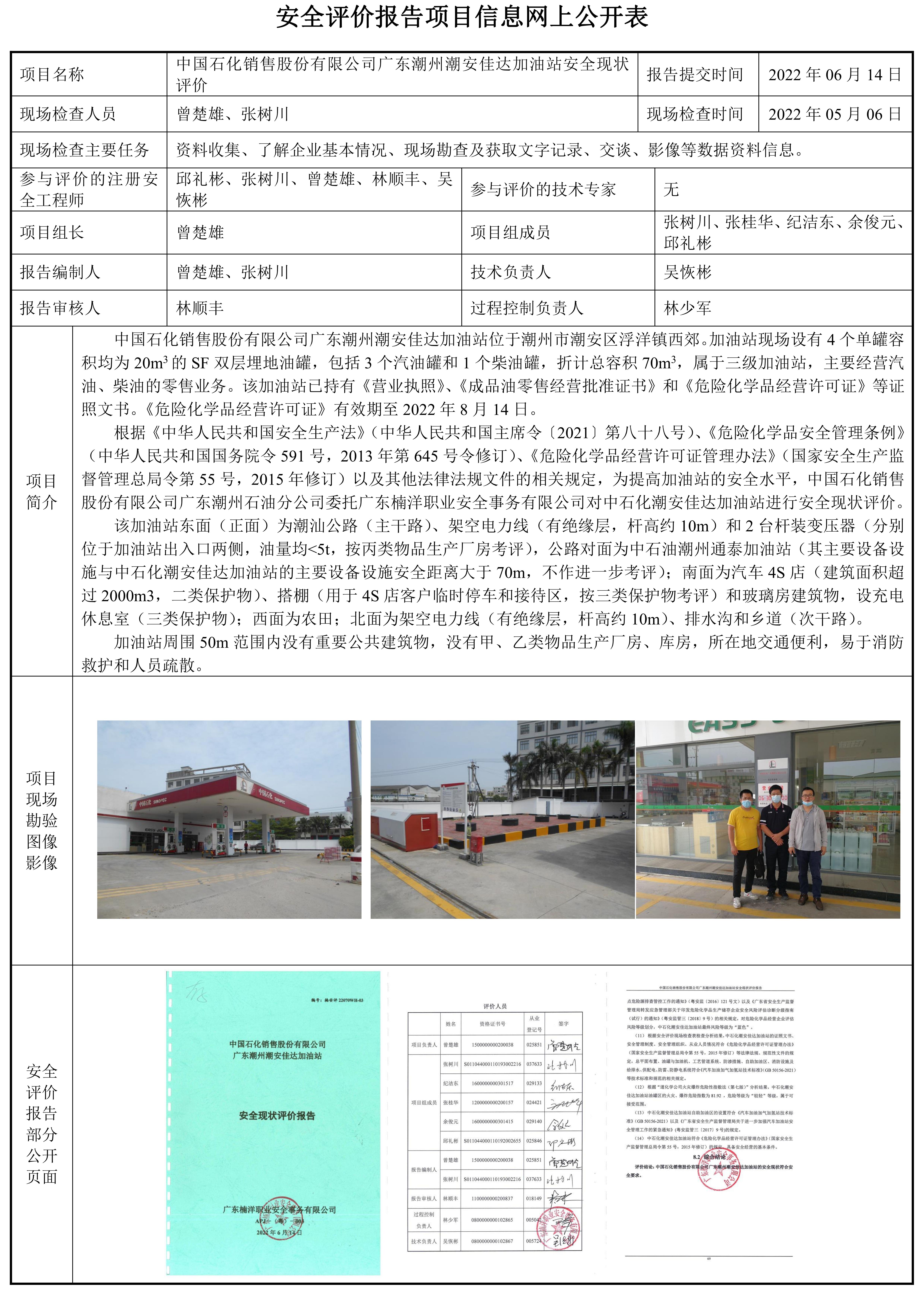 中国石化销售股份有限公司广东潮州潮安佳达加油站安全现状评价报告
