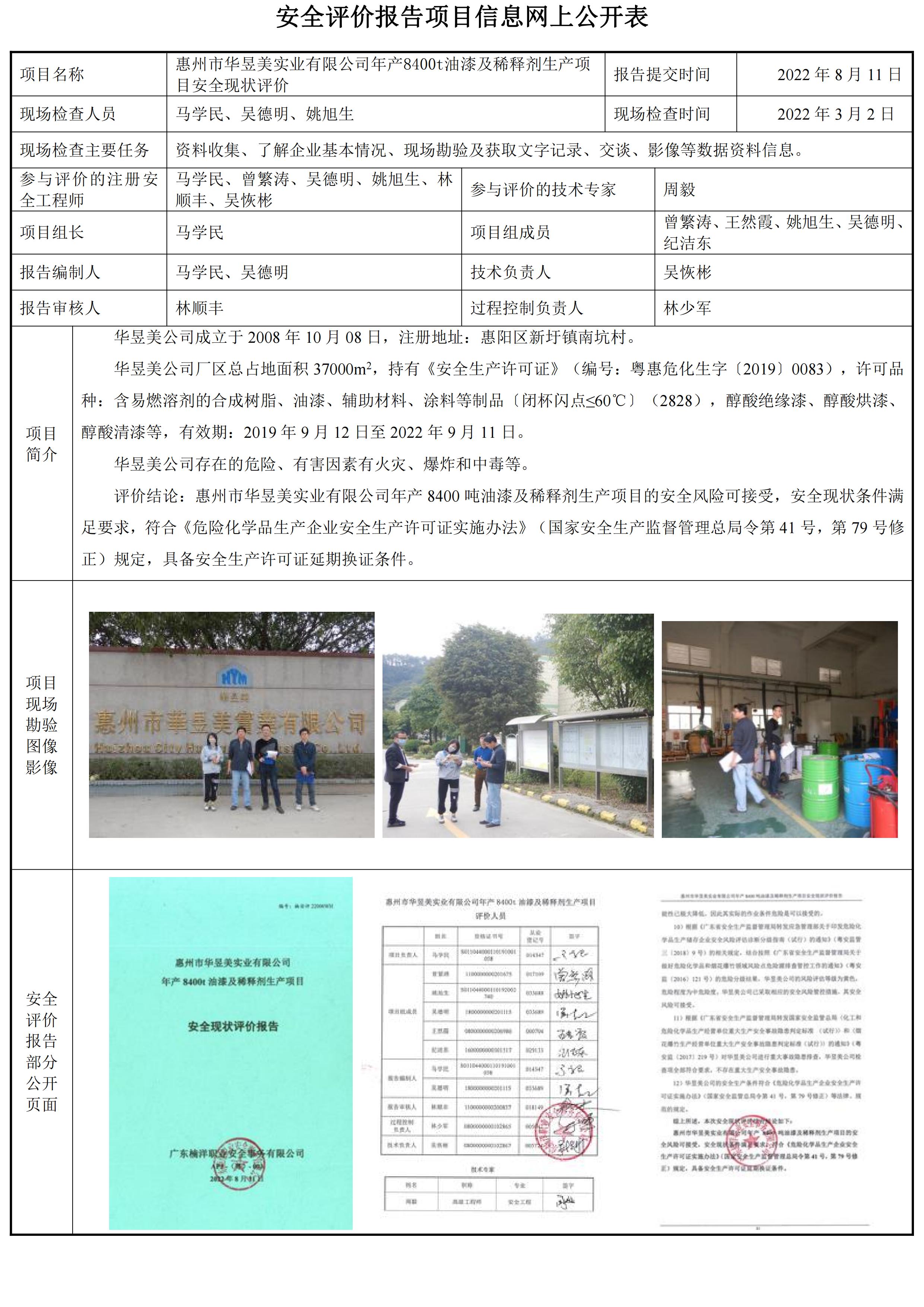 惠州市华昱美实业有限公司年产8400t油漆及稀释剂生产项目安全现状评价报告