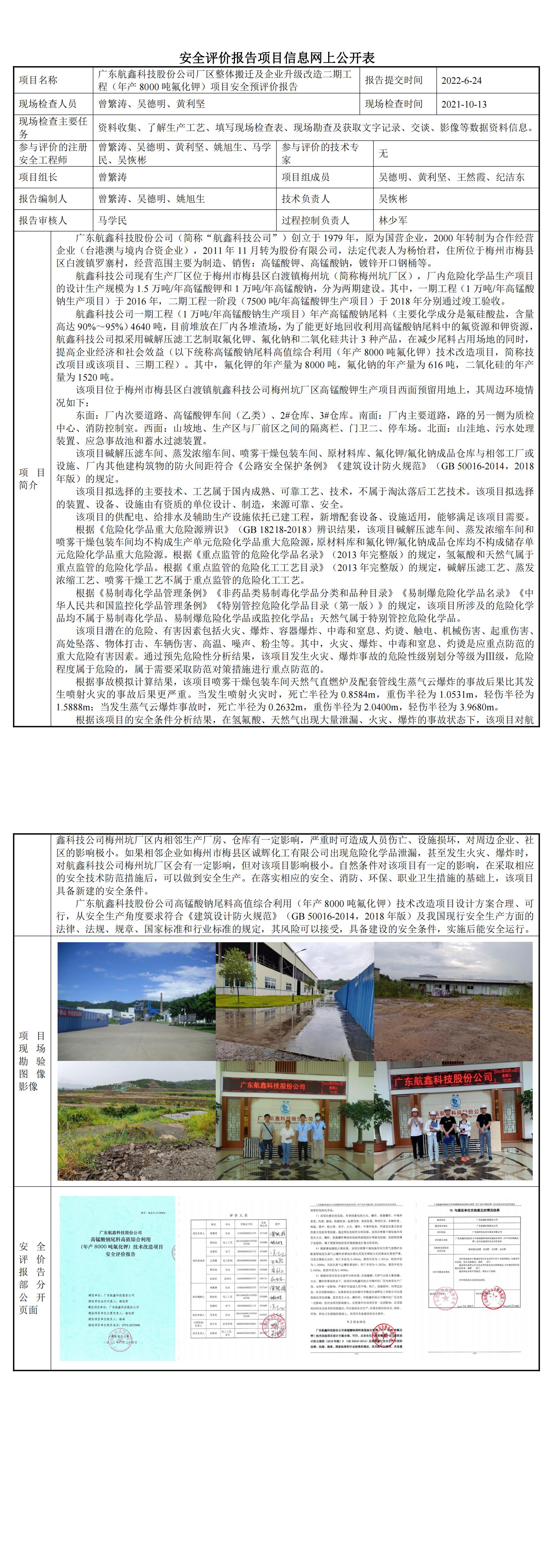 广东航鑫科技股份公司高锰酸钠尾料高值综合利用(年产8000吨氟化钾)技术改造项目安全评价报告