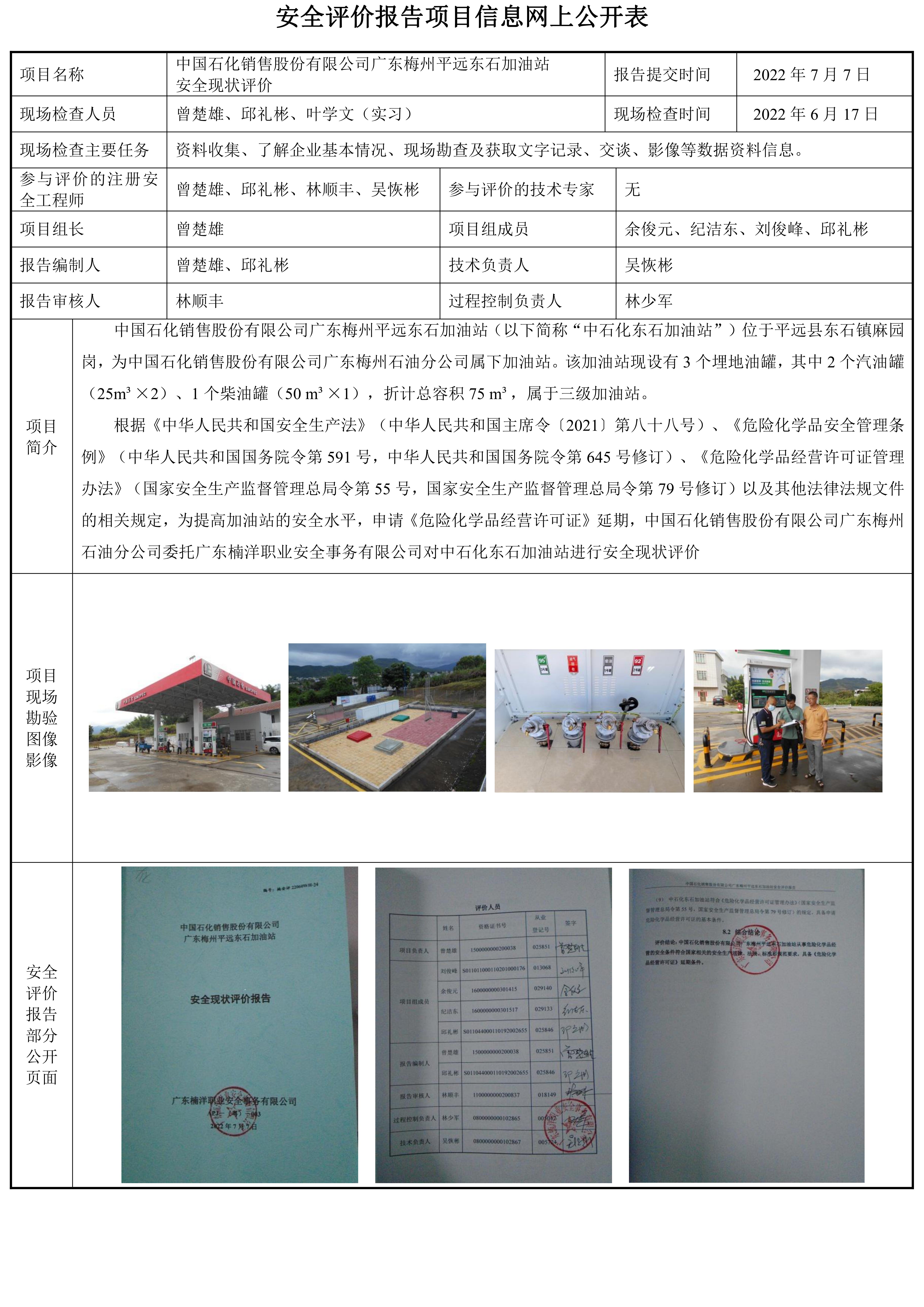 中国石化销售股份有限公司广东梅州平远东石加油站安全现状评价报告