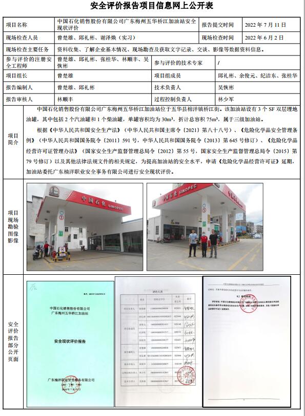 中国石化销售股份有限公司广东梅州五华桥江加油站安全现状评价报告