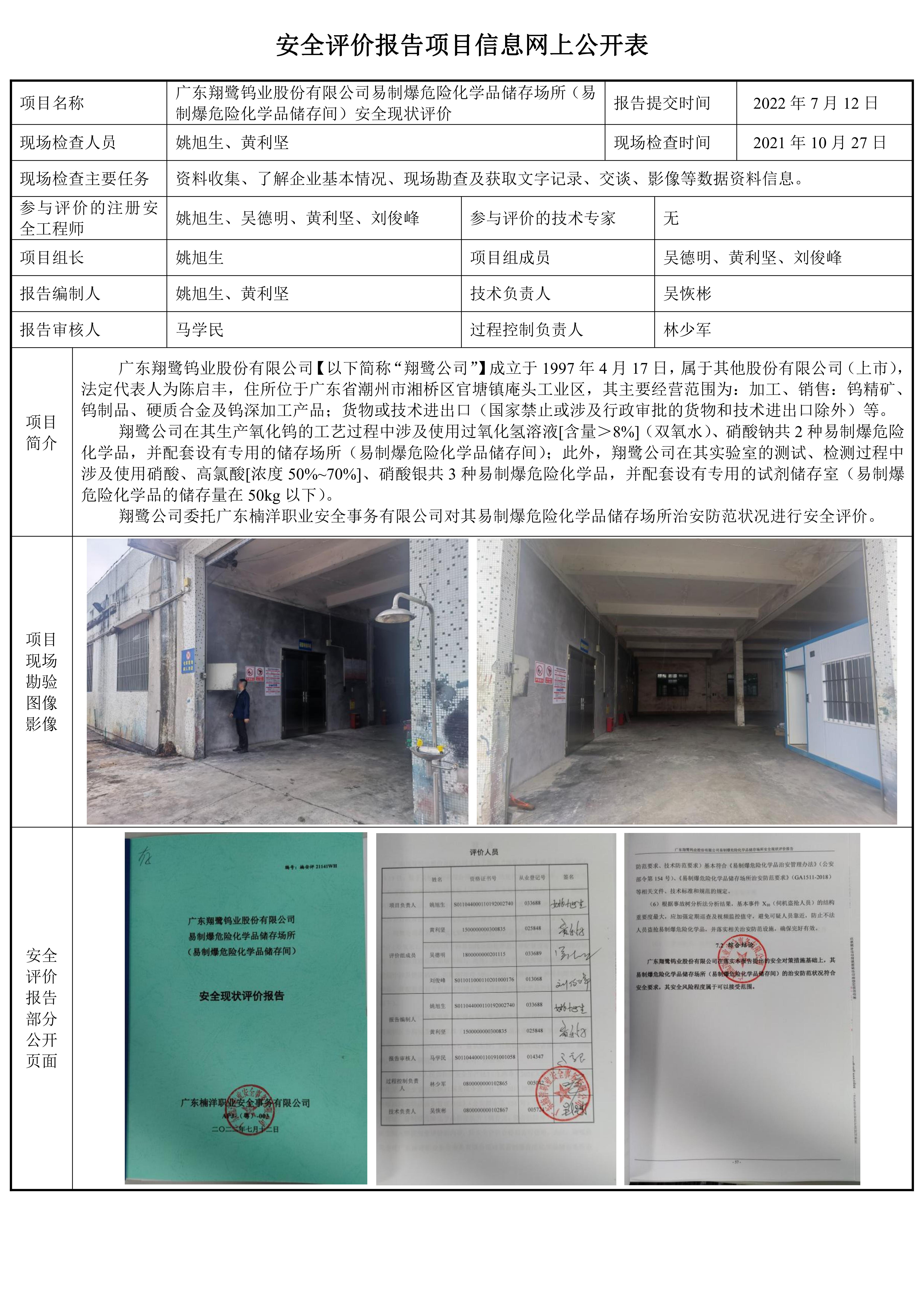 广东翔鹭钨业股份有限公司易制爆危险化学品储存场所(易制爆危险化学品储存间)安全现状评价报告