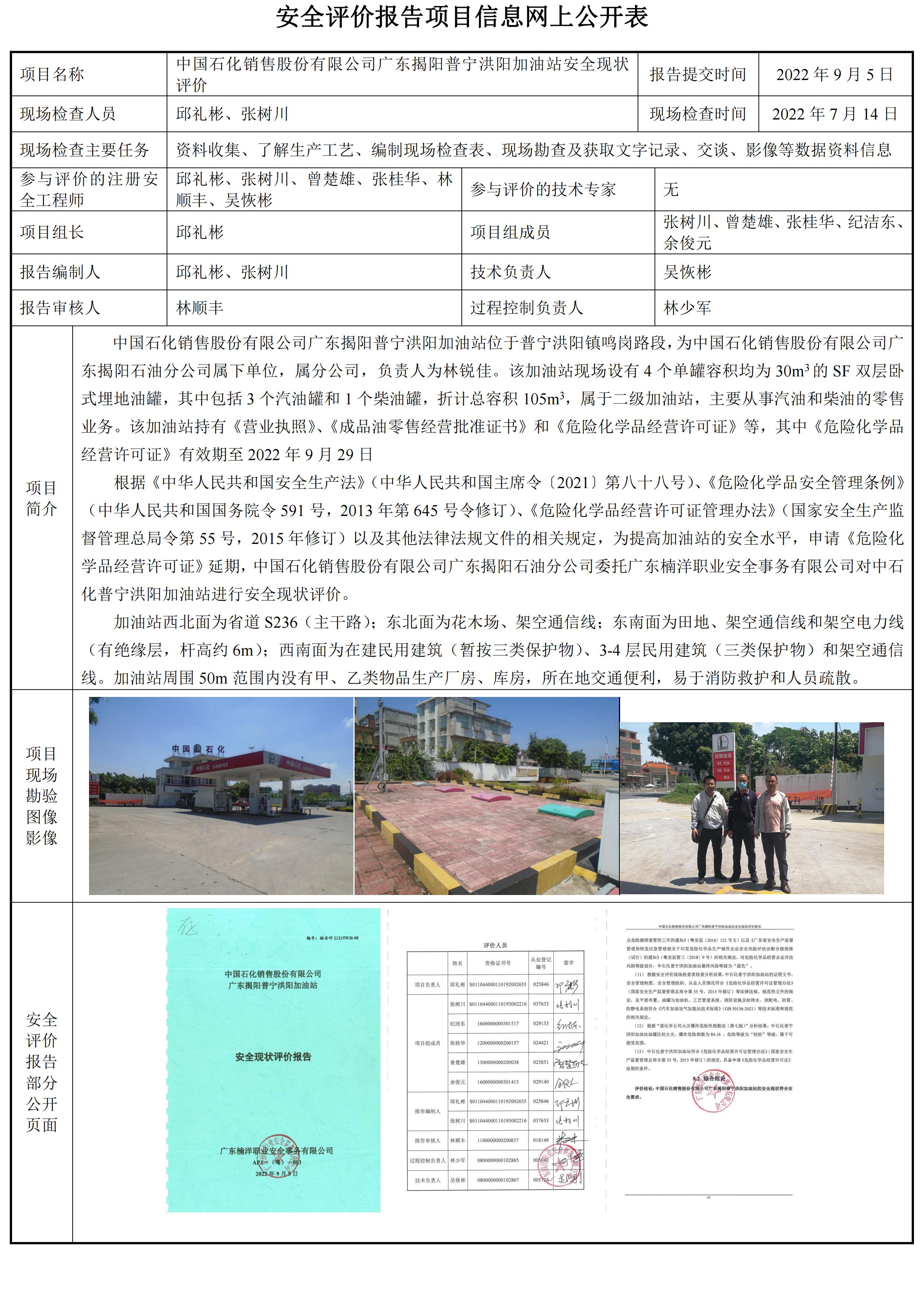 中国石化销售股份有限公司广东揭阳普宁洪阳加油站安全现状评价报告